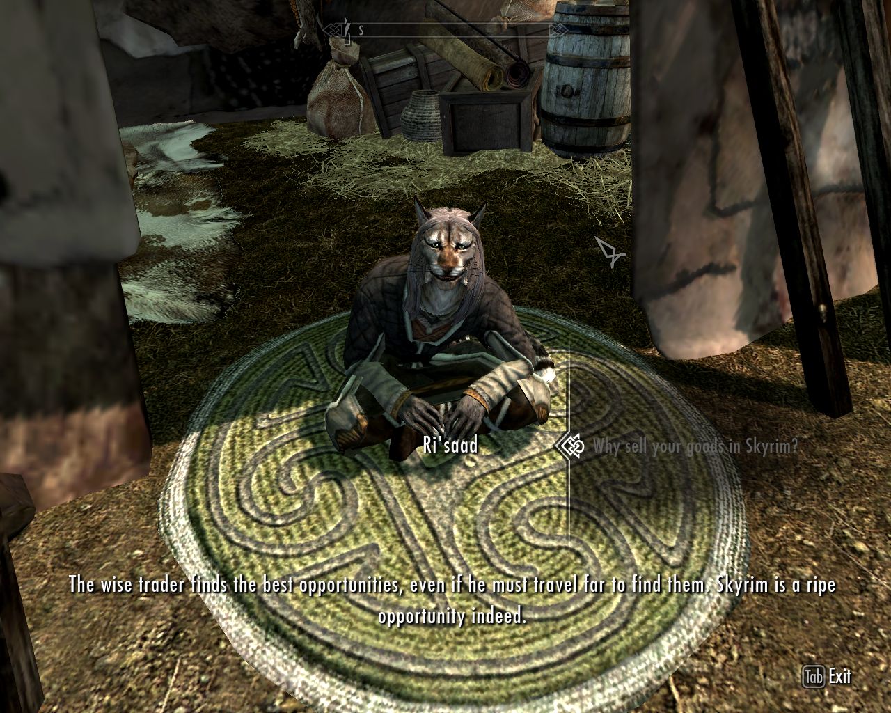 I ask Ysolda what she does and she says she's trading with the Khajiit merchants, the very same I met earlier today. She's striving to become a serious trader and maybe even buy herself an inn one day. We seem to share a fascination for Khajiits which Ysolda tells me is far from common among the people of Skyrim.