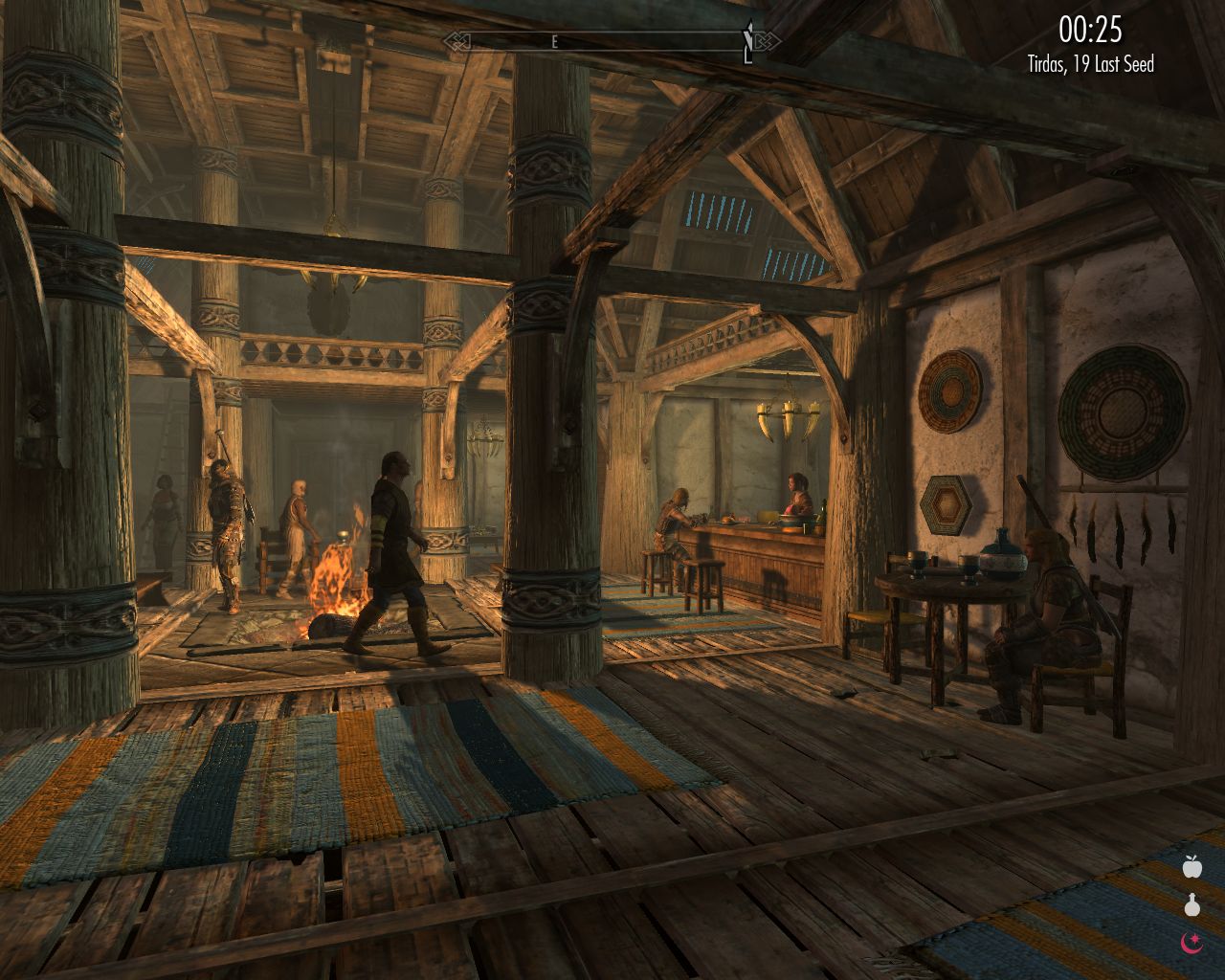In spite of the late hour, The Bannered Mare is bustling with activity. The locals of both sexes are bantering back and forth or simply sitting and drinking. New people keep coming in. Needless to say, I don't know anyone here and the loud merry atmosphere is a little intimidating, especially since I've been picking up vibes of some people in Hviterun disliking some other people, but I can't understand yet what it's about, so I'm worried about saying something wrong or possibly even being seen with people I shouldn't be seen with.