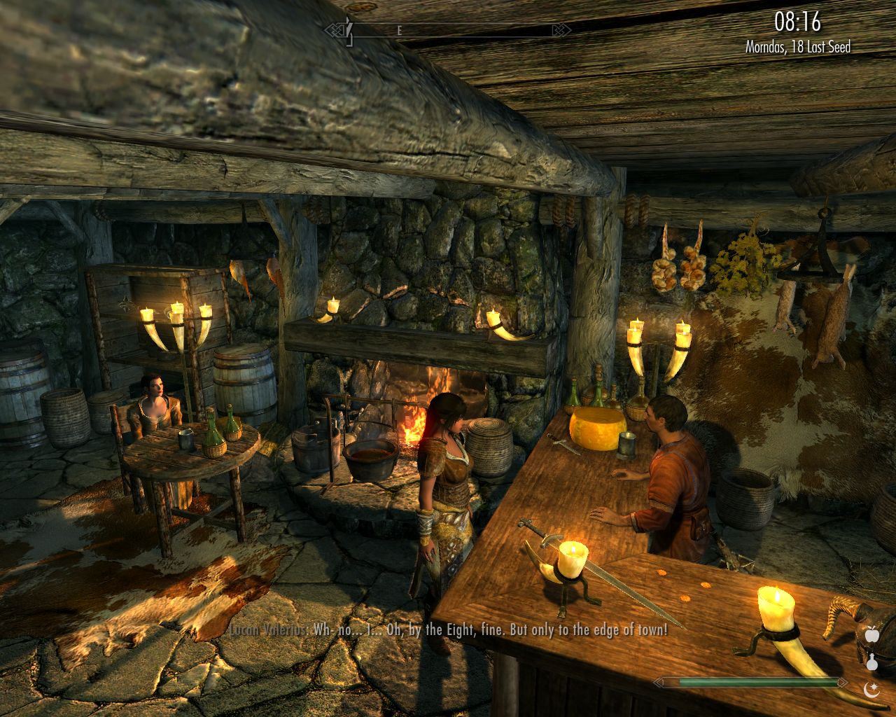 So I'm most relieved when Ysolda walks in. We find a table in a (relatively) quiet corner and she tells me about a super rich High Elf called Pelin Varlais who lives in a castle southwest from here and has an ancestral sword stolen from him recently and is very eager to get it back.