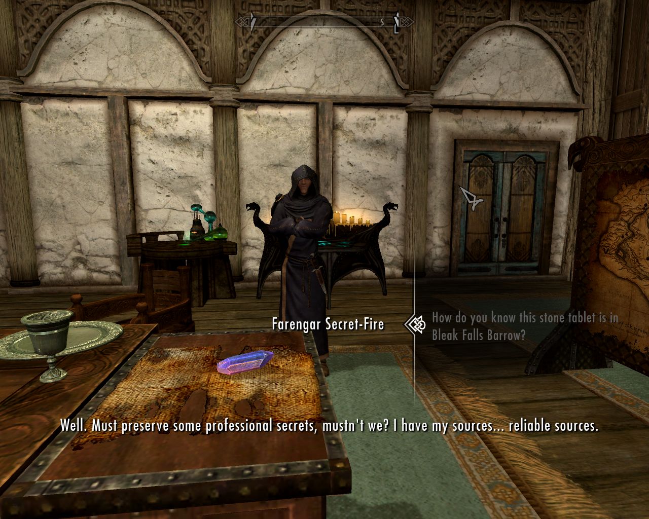 Well, turns out the court wizard Farengar, a haughtyish but not, I believe, entirely unkind man, needs an important object named Dragonstone (a stone tablet, actually), which he believes to be hidden in a dangerous place none other than Bleak Falls Barrow.