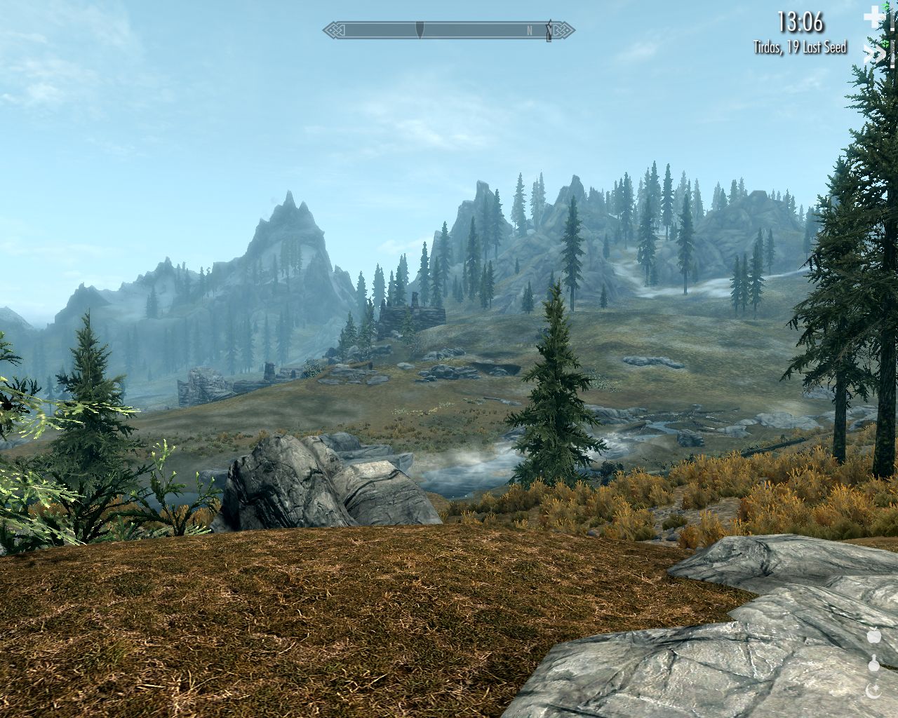I spot the Halted Stream Camp early enough to sneak closer and take up an ideal sniping position on a nearby rock overlooking the whole camp. The only problem is that it's too far to see our potential targets properly. I have an inborn special power called Khajiit Sense of Smell , which is not really a sense of smell, but makes nearby creatures glow in my mind's eye in various colors, depending on if they're hostile on not. Usually Khajiits have it and humans don't, hence the name. That bandit camp below me is, unfortunately, too far for my Sense of Smell power. There's only one thing I can do – sneak closer downhill. That has the result that the enemies notice me before I can target them.