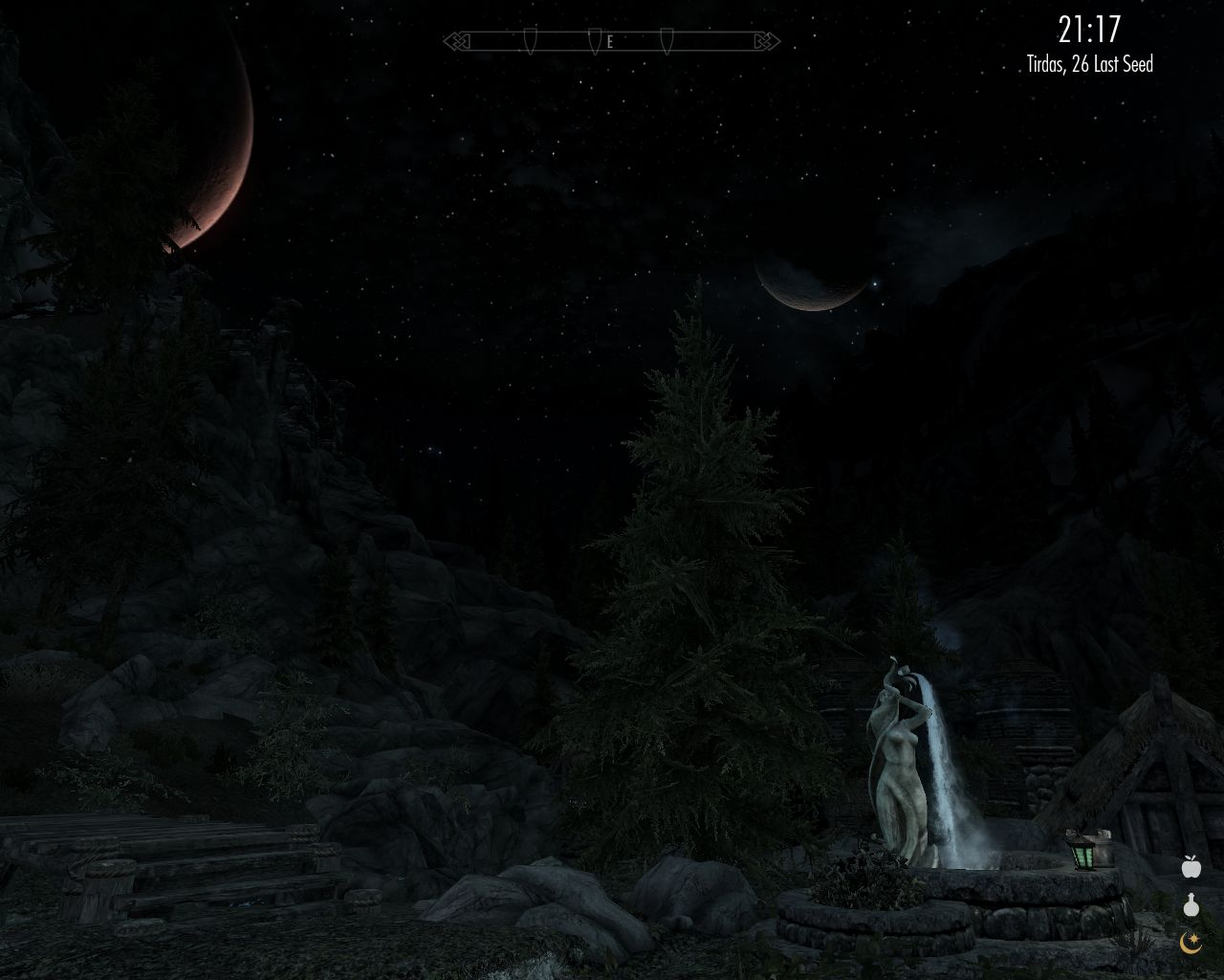 I stand a while next to a beautiful statue and absent-mindedly watch the guards patrolling the streets. It gives me the feeling of safety. A man named Thadgeir asks me to bring a package to Runil, the priest. I do that, and it improves my mood somewhat. Then I return to the inn after all and basically just listen quietly to my girls' chatter. At quarter past 11, I decide to turn in. Tomorrow will be a better day. It's bound to.