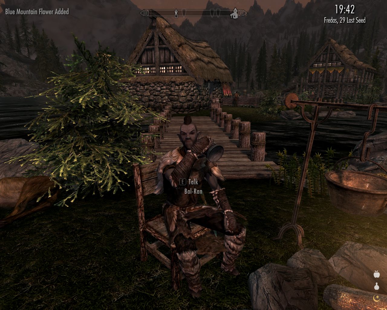 We walk around leisurely. Among other things, I have a chat with an old man Dengeir, an uncle of Siddgeir. He was the previous jarl. He says he was deposed because he supported the storks. He is very bitter and asks me to break into the house of Lod the blacksmith and steal a letter he has been writing – to the imps, Dengeir suspects. No, I'm certainly not going to have any part in that.