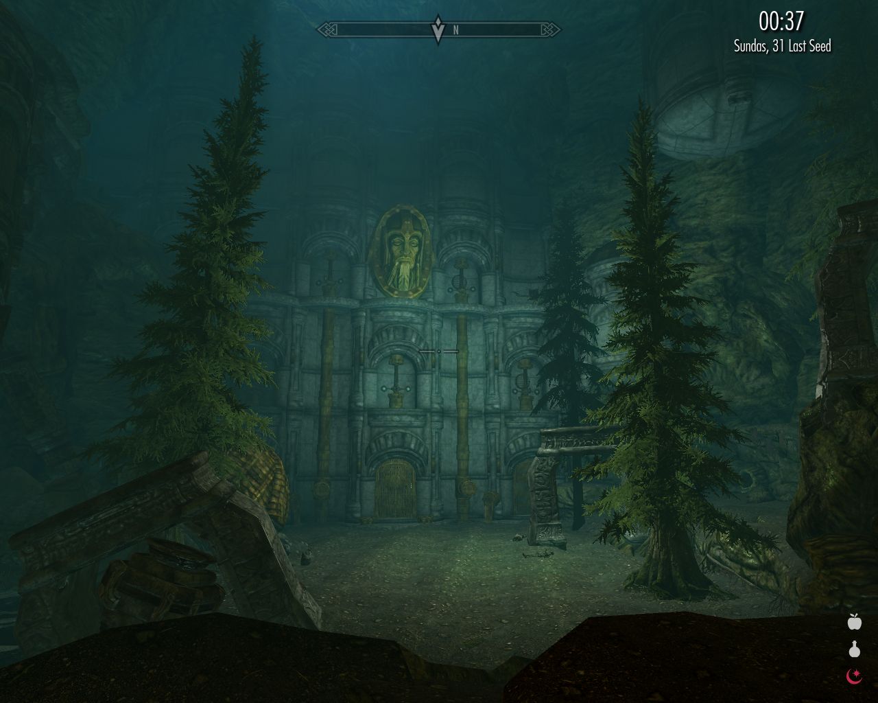 But right now we're going in the opposite direction. The fine warm weather raises our spirits after that close encounter with death. After a while we arrive in a curious town Granite Hall on the hills north of the road. It has massive stone buildings, partly underground. It's a former Dwemer city, so I can expect Arkngthamz to look something similar – albeit, I presume, in a significantly worse state of repair.
