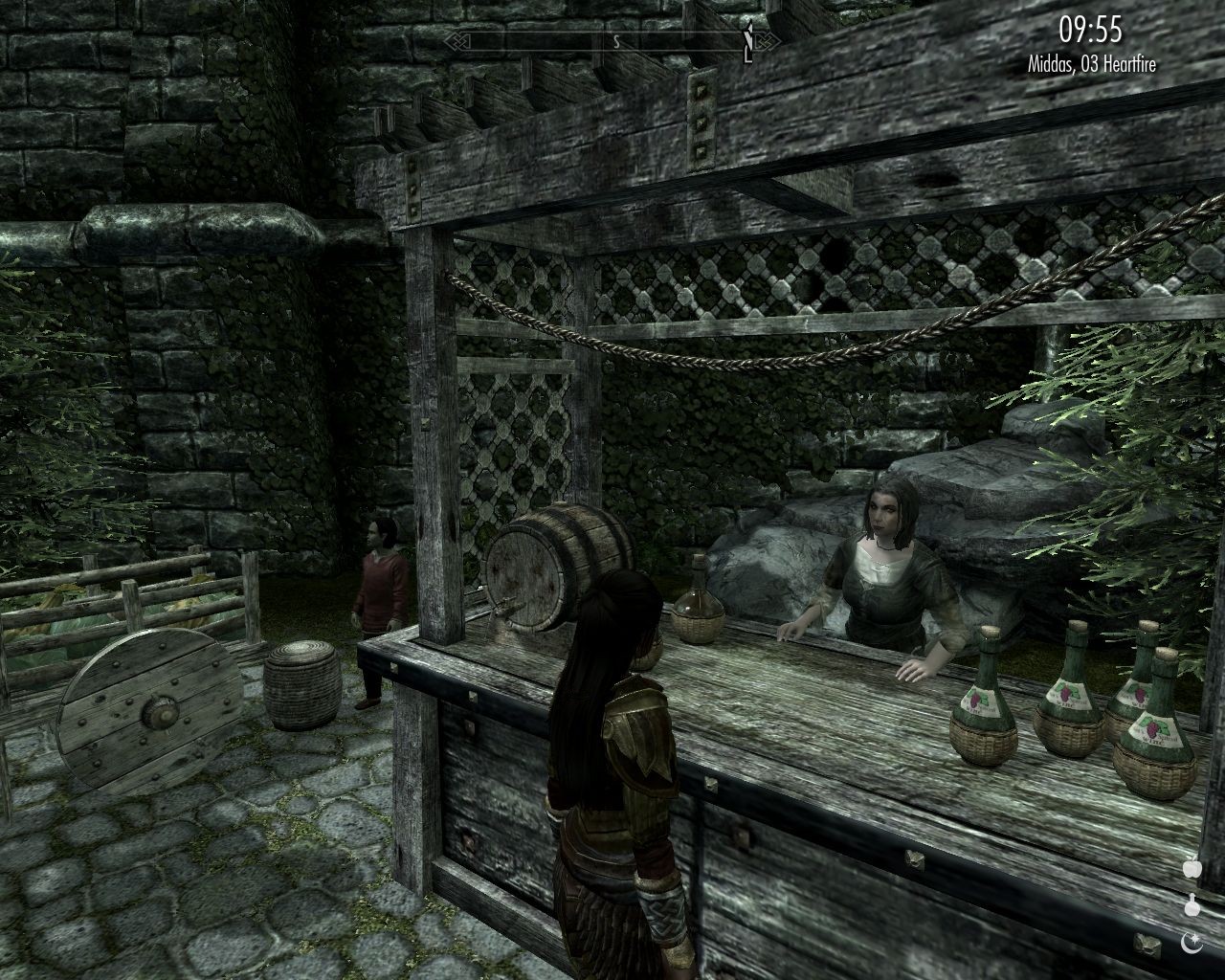 Naturally I chat a little bit with every trader – with the exception of an incredibly grumpy elf Endarie; she sells fancy expensive clothes. On the marketplace, the alcohol vendor Evette complains that a shipment of hers is being held at the harbor.