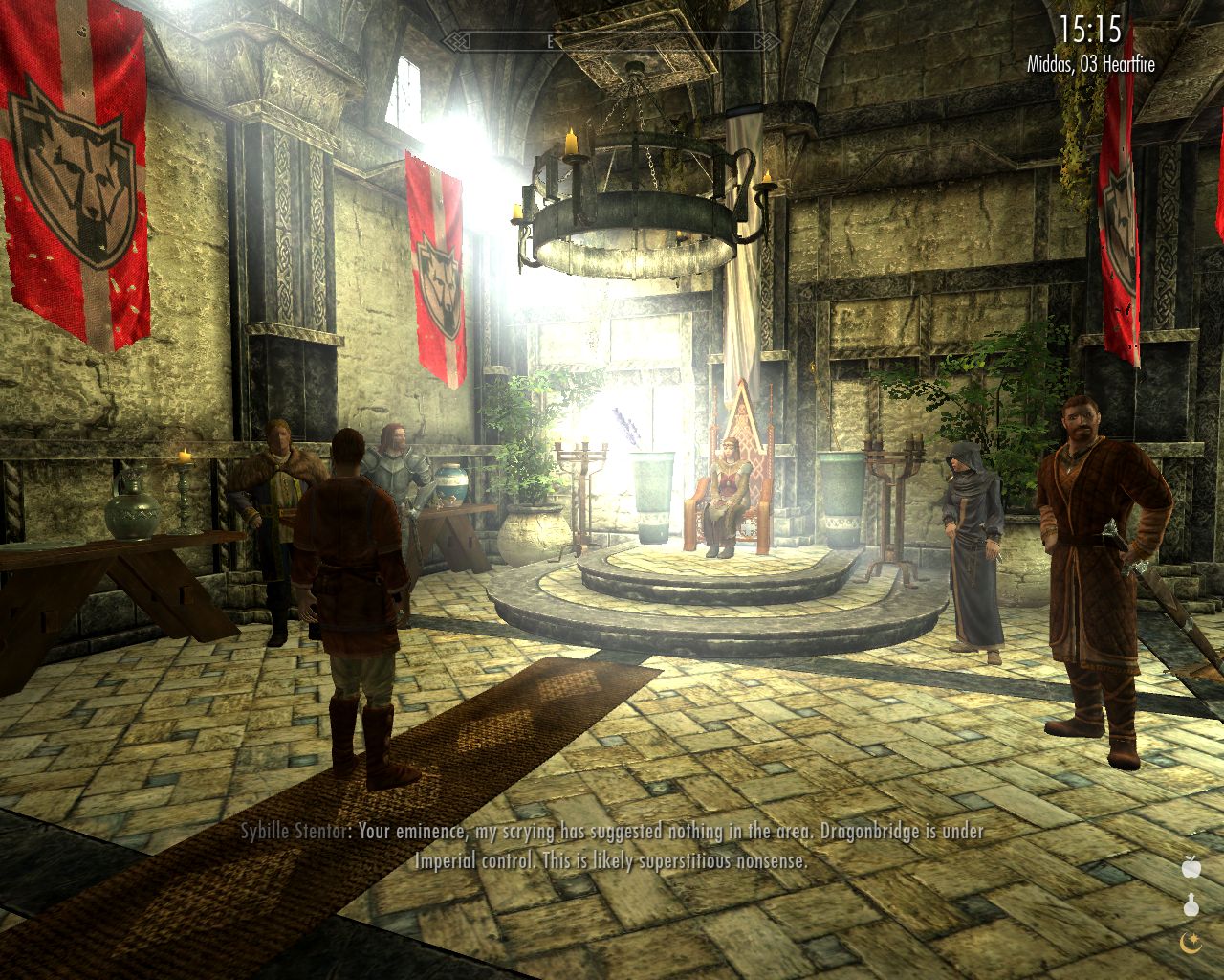 In addition to those two, there are two thanes present, a man named Erikur and a woman named Bryling. The two seem to be bickering about everything. Jarl Elisif, the ruler of this hold known as Haafingar, is clearly unable to rule anything. She looks lost like a cat on a float. All her four advisers seem to be competing to get their voices into her ear while retaining the appearance of civility. I feel sorry for Elisif, but there's nothing I can do for her.
