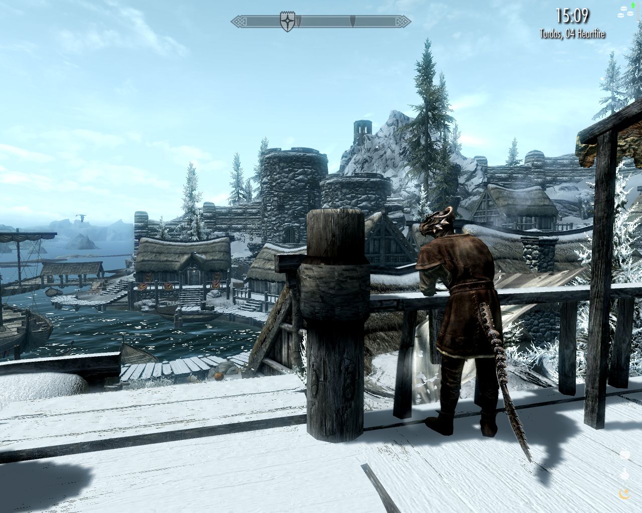 But I'm not going to rush after him right away, no matter how urgent he insists this matter is. I have dinner and then a little walk around town. I can't go to sleep yet, because Lydia has struck up a friendship with one of the town guards and I want to help them find a private place. It so happens that the alchemy shop is completely empty at this late hour. I saw the proprietress at the inn. So I pick the lock to let Lydia in. The guard whose name is Bjarne arrives a few minutes later. I smile encouragingly and motion him to enter, promising to not let anyone disturb them. I remain standing on the empty quiet street. Apart from an occasional guard patrolling in the distance, there's only soft swashing of the water in the harbor. Why isn't it frozen, I wonder. Maybe because of the boats coming and going?