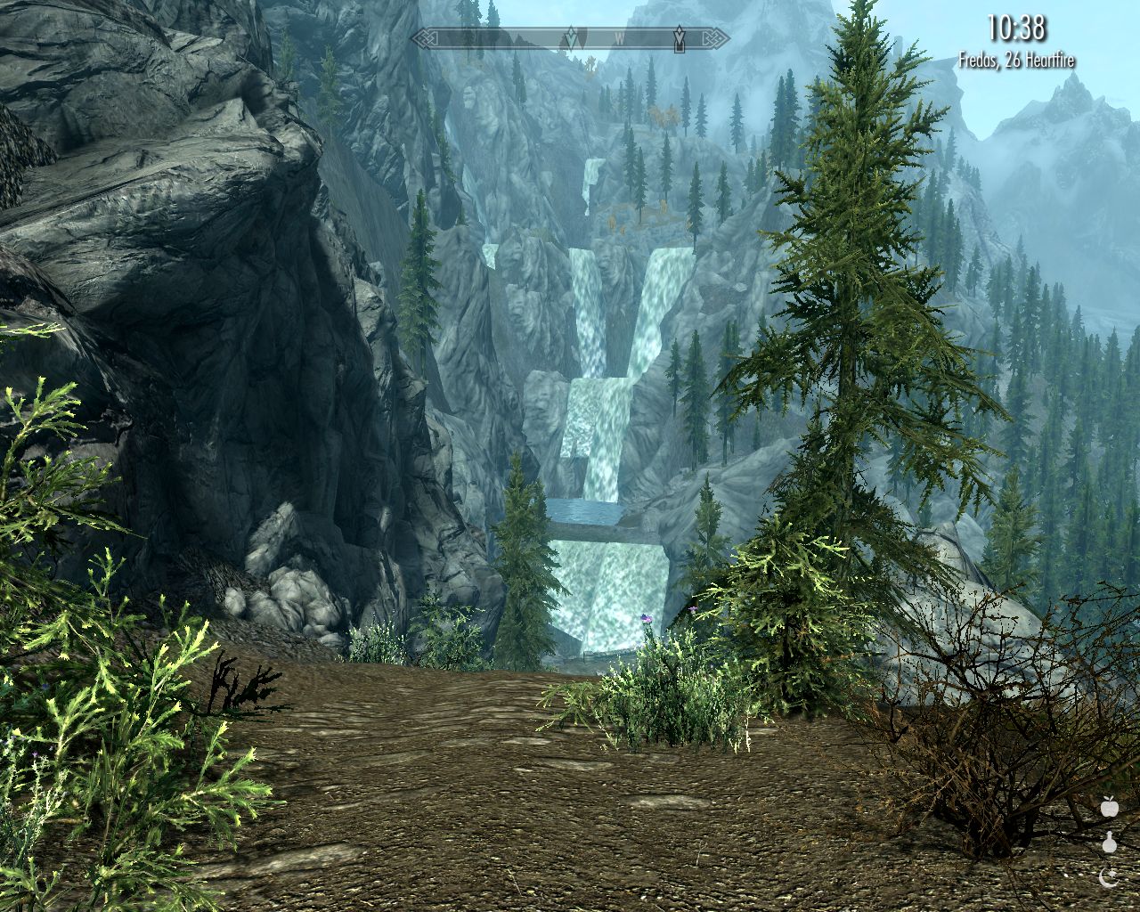 That's where we'll go too. Realizing that we've digressed so far south that Ivarsted (in the ancient times spelt "Ivarstead") is actually quite near, I figure we'd better skip that relatively unimportant quest in the mountains and head straight for the possible location of Aetherium Forge south of Ivarsted. On our way there, since we're already in this region, we'll drop by High Hrothgar. Has to be done sometime. You may remember, that's the holy place where I'm supposed to go, summoned by that elusive and mysterious order of Greybeards – or Gaybores, as Bardslayer calls them. He doesn't seem to have a very high opinion of them.