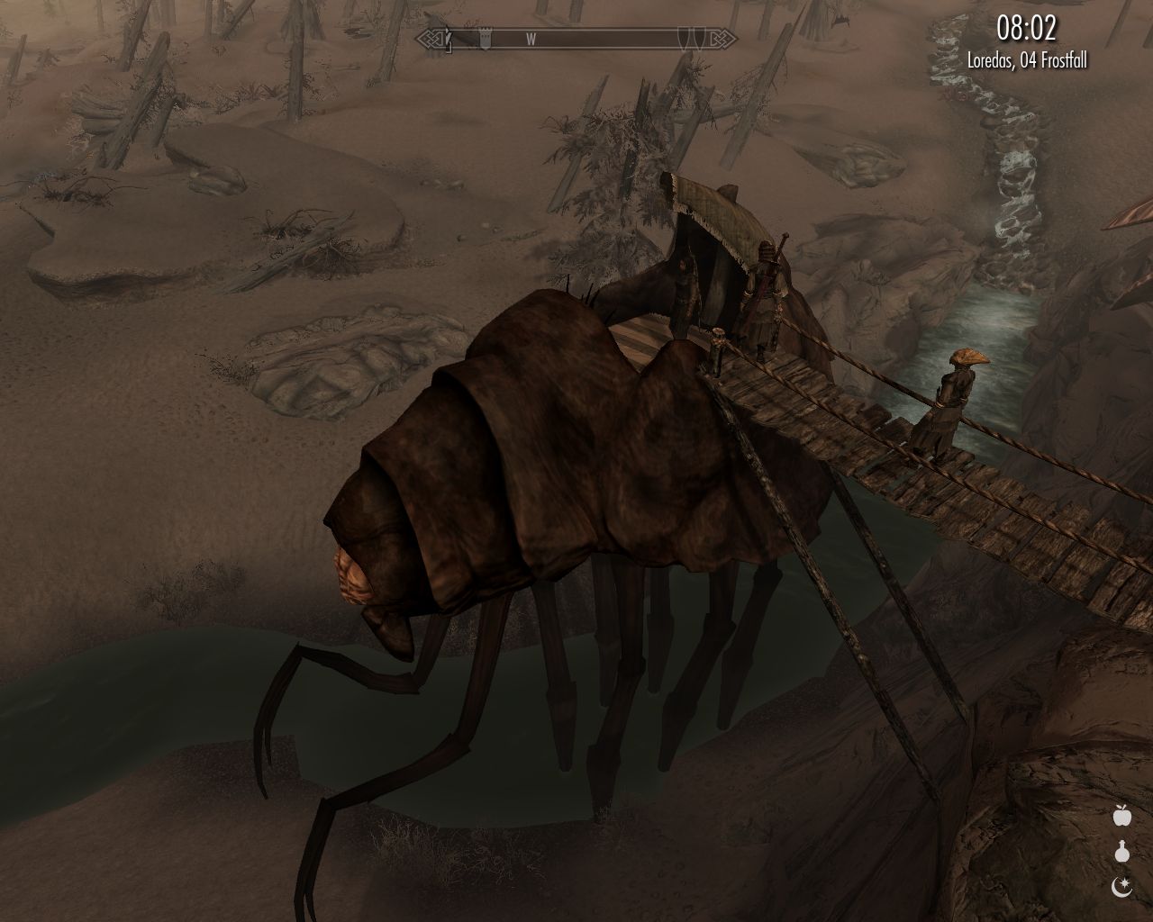 Shortly before Tel Mithryn, we encounter an elf named Revus who is offering all passersby an opportunity to look at a rare animal called siltstrider . At first glance it's similar to a netch, and it's indeed of similar size, but actually it's an 8-legged arthropod.