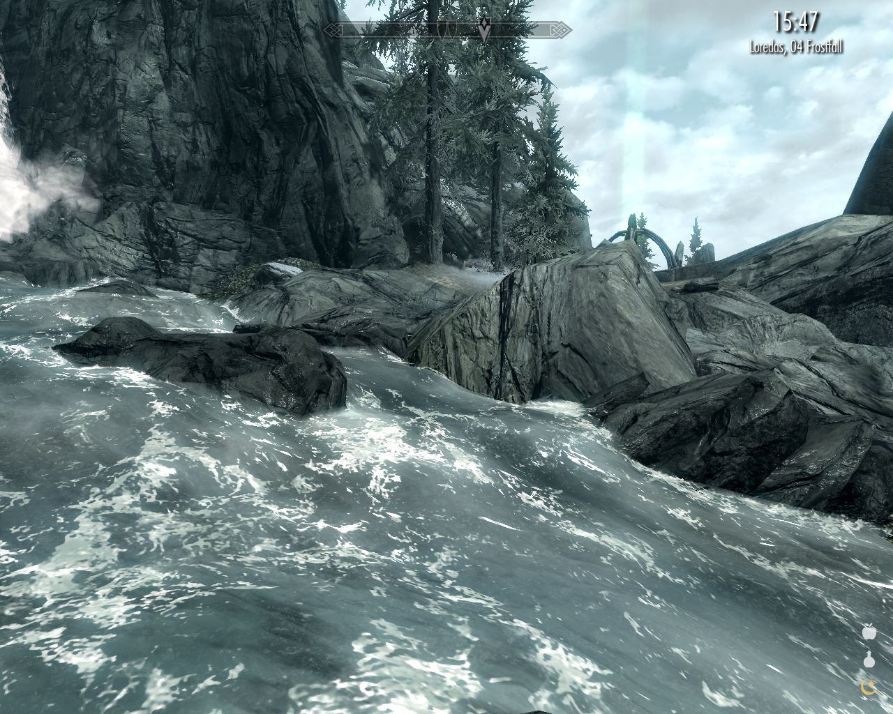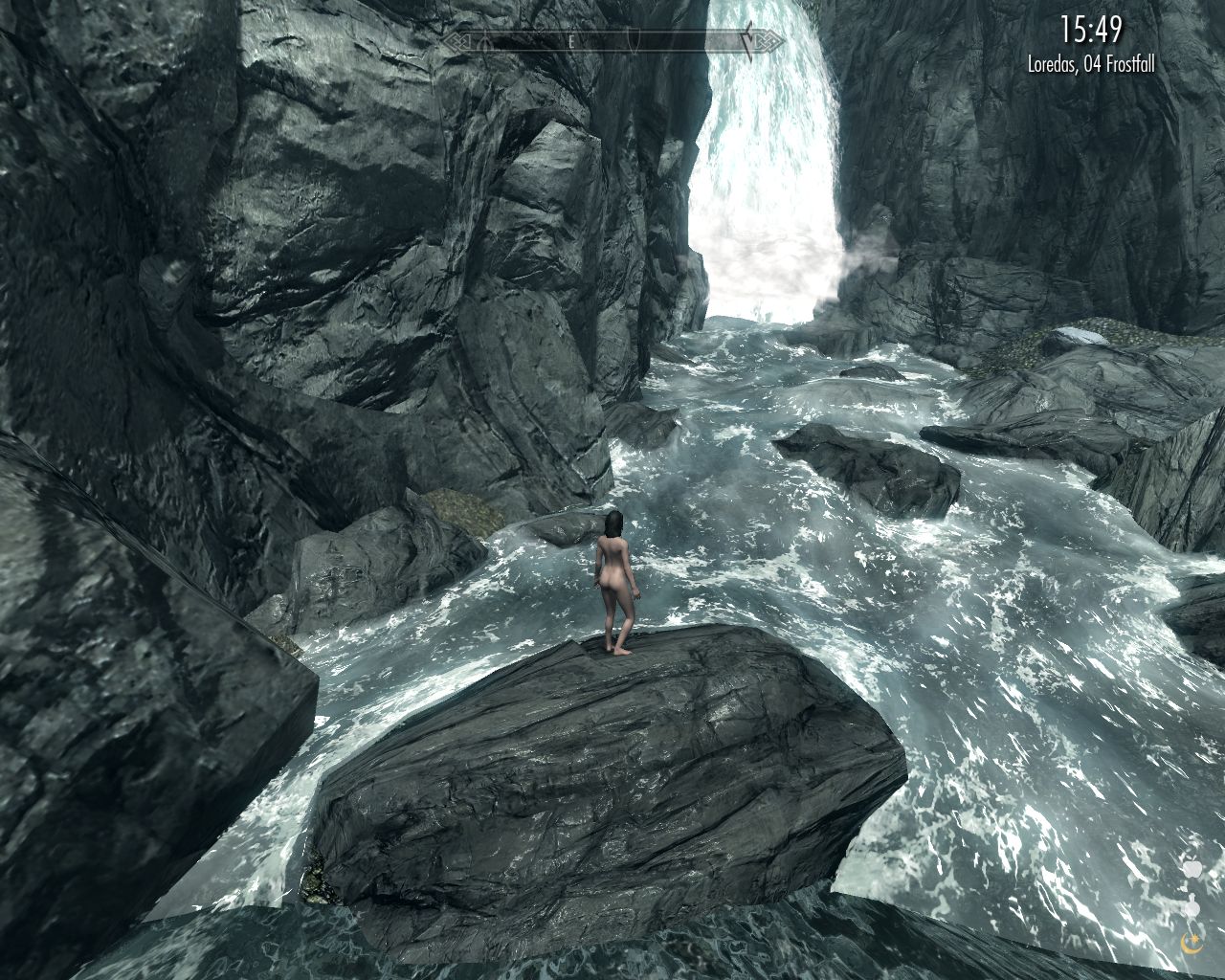 Trying to swim in armor is out of the question here. The drop down the waterfall just beyond the lower right corner is deadly.