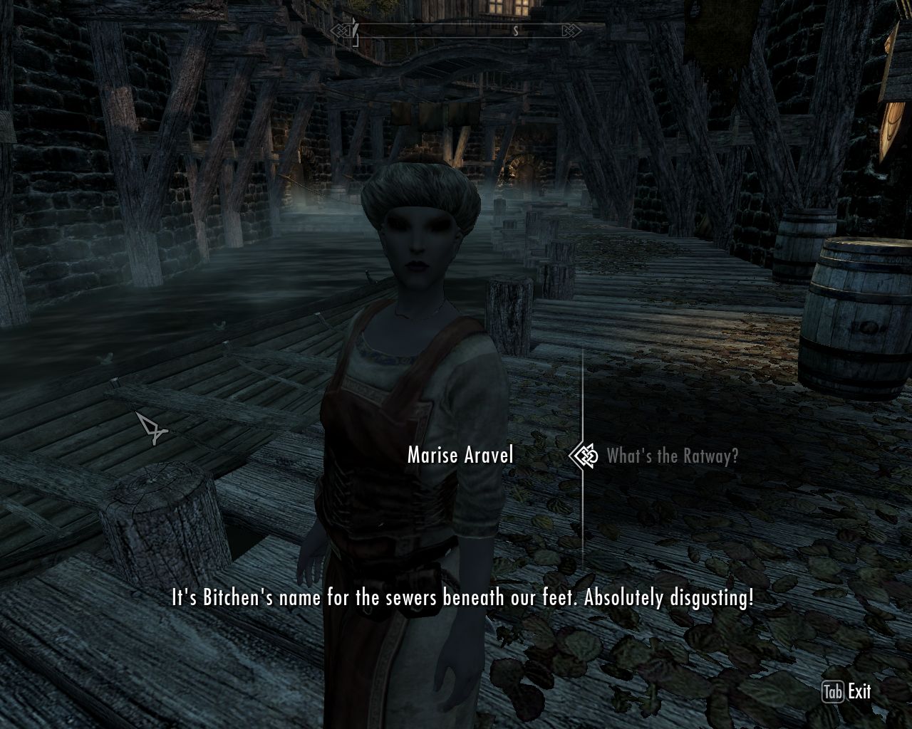 Bitchen is a big city. There are so many people and so many things to see. I hear a crazy-looking man Jalamar complaining that no one would listen to him. Then there's a wimpish guy Aerin talking to Mjoll, apparently his girlfriend who has a large battleaxe on her back as well as her head in the clouds (and his undoubtedly between her legs). Her heart is in the right place, though. She gives me the beginnings of the general picture. The biggest menace in the city seems to be something called the Thieves' Guild. They reside in a place called the Ratway and she wishes she'd find a way to root them out.