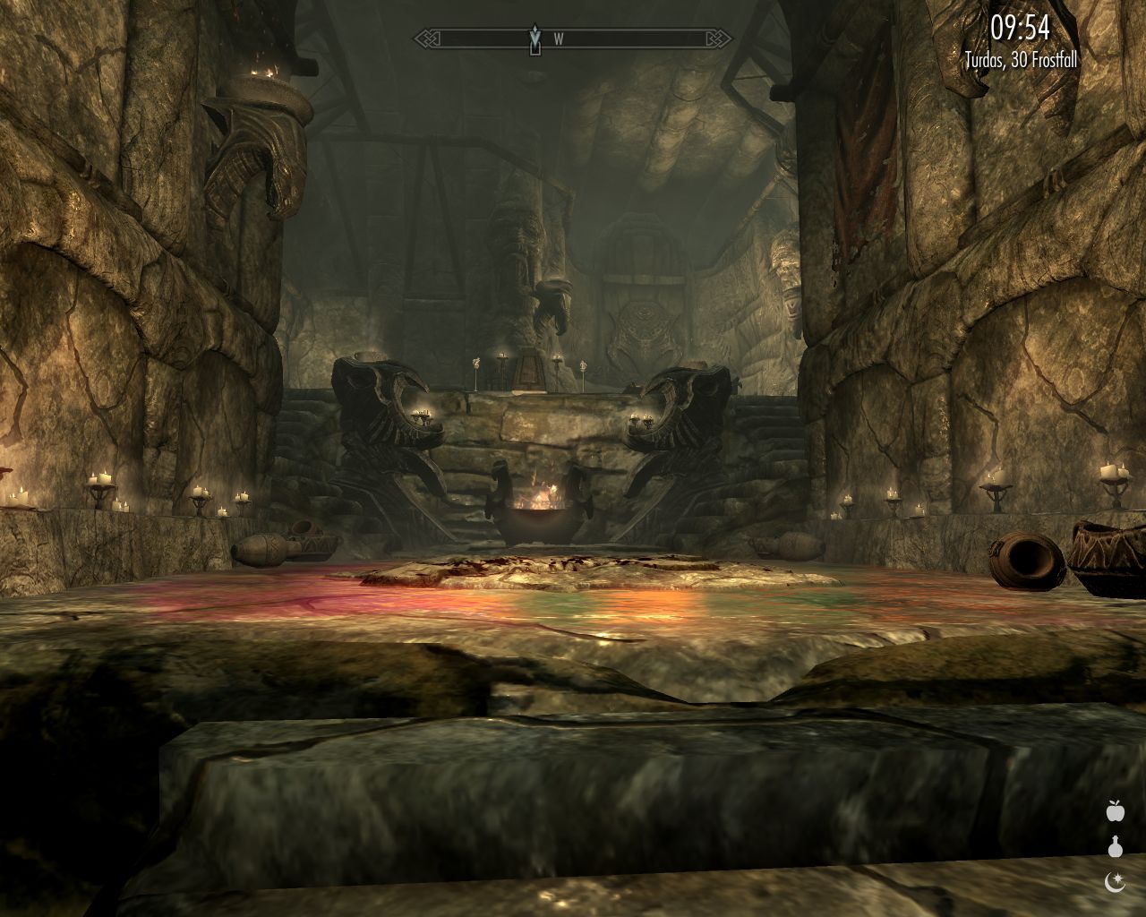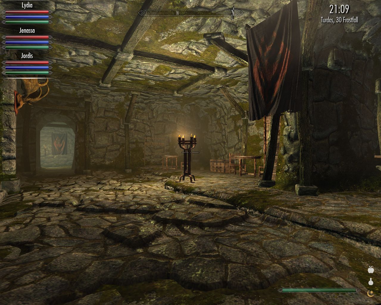 There are mages and a few walking skeletons and one skeever. I bungle this mission rather badly. At one point, I manage to end up in a melee fight against two skeletons in a place too narrow for my followers to help me. In another place, I sense from afar an enemy who is lying down, apparently asleep. I sneak closer most carefully, forgetting to use Sense of Smell again. In the less-than-perfect light, I see two other mages when I'm only a few meters away from them. They are standing and very much awake. Needless to say, they see me too, and while we're busy fighting them, the sleeper wakes up and joins the fight. There's a fourth one who had also been sleeping. I see her fall down from something cast by a follower of mine, so I focus on taking out the other three. When that is done, I sigh with relief and begin to look around. Suddenly I notice I'm taking damage again. That fourth mage is casting fire spells at me. I realize she was not dead, merely paralyzed. Inadmissible laxness on my part!
