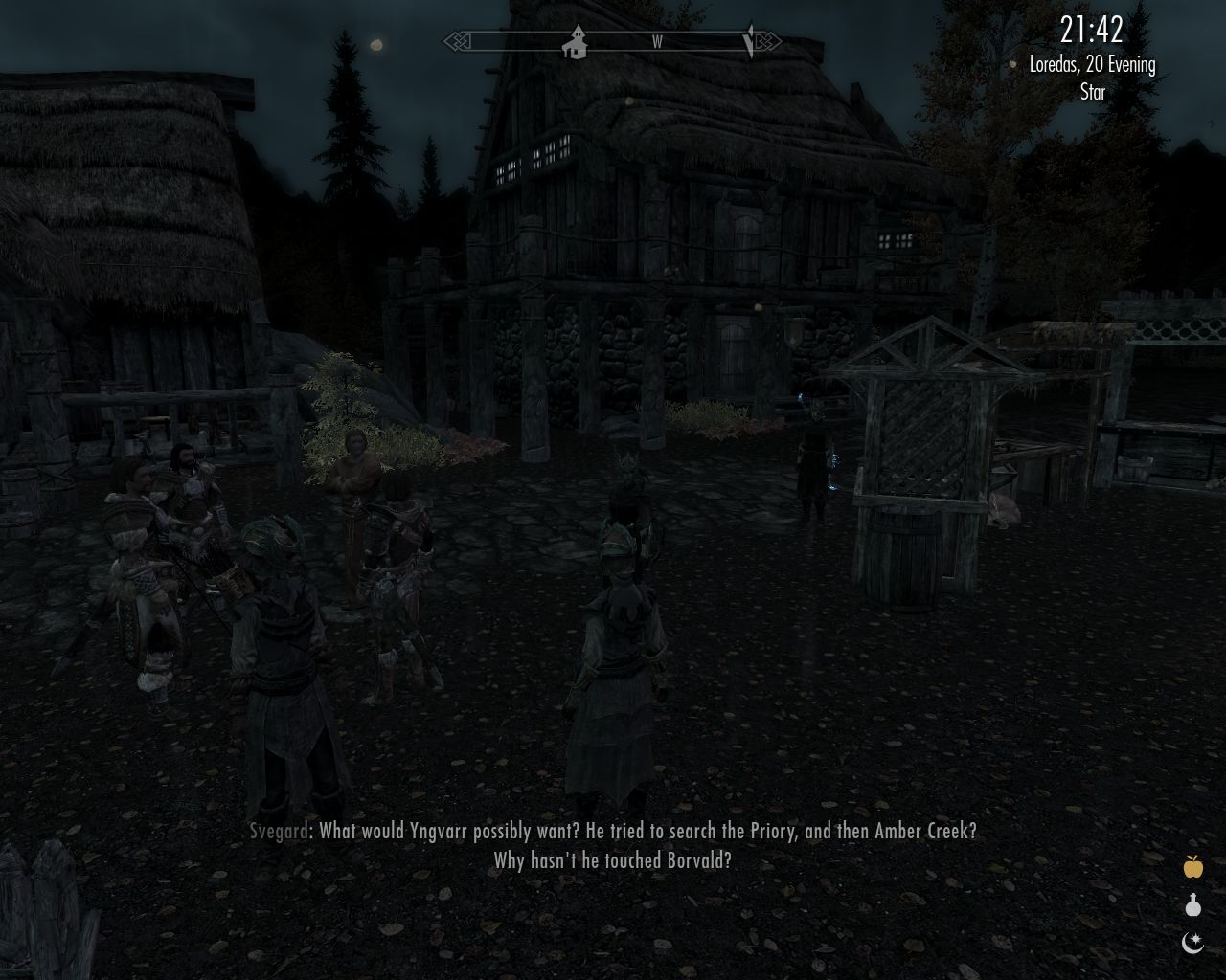 Whatever. Shortly after Yngvarr has left, the jarl's attention is drawn to a newcomer. It's Brother Thorlogh from Bailun Priory. He tells us a lengthy and emotional tale of Yngvarr having invaded the priory demanding to search it, and killed one of the priors who tried to prevent him. Those blabbermouths could become world-famous stage performers. I would gladly go to see them myself, if it were under the sun on a nice field outside Hviterun's city walls. But such dramatic verbosity couldn't be more out of place in the late evening among confused soldiers when all signs indicate that a full-scale war is about to flare up any day now.