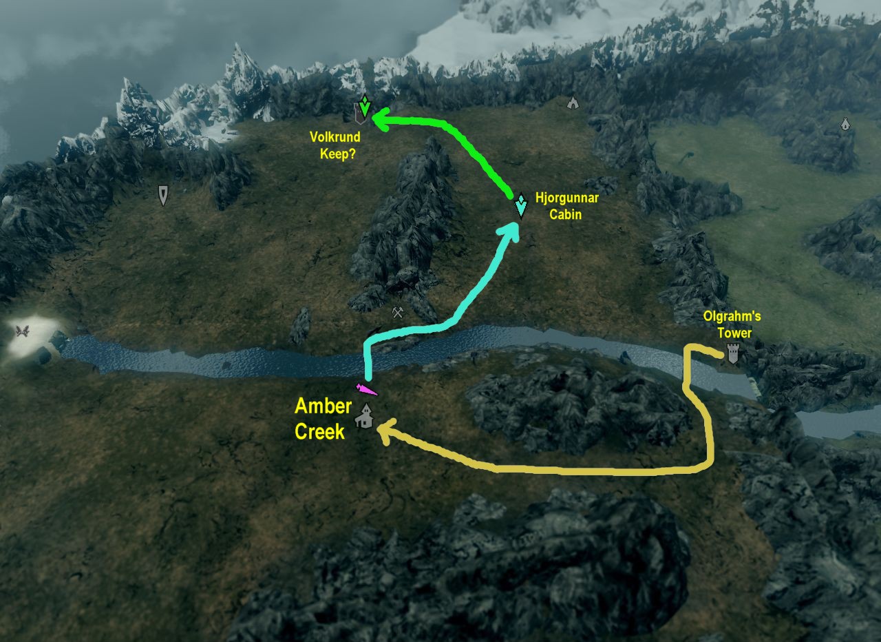Now we shall cross the nearer bridge, the one that leads to the Amber Creek Mine. On our way to Volkrund Keep, we're going to make a slight detour and bring Jarl Agnar's message to the Hjorgunnar brothers.