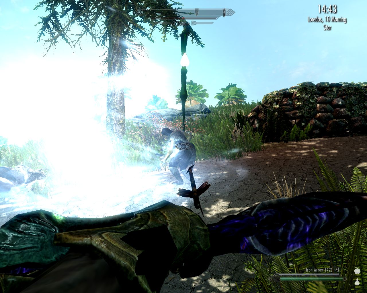 As you can see from the picture above, something hostile is moving towards us already. When it comes closer, we see it looks like a white ball of energy. I shoot it dead. Without approaching the grove, we proceed along the road. That Dusk place shouldn't be far now.
