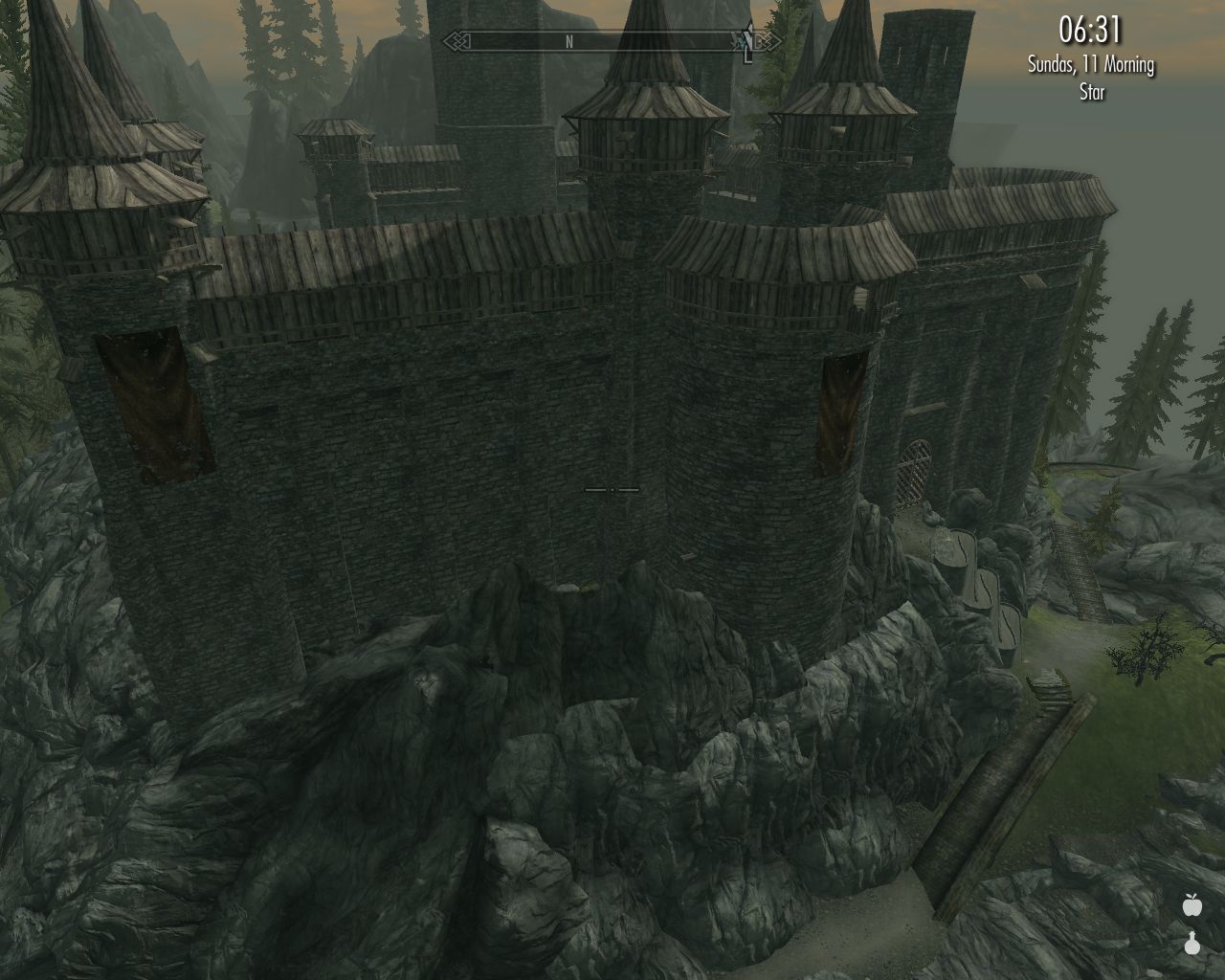 Observe the winding walkway descending from the gate to the place where we had our first contact with the bandit mages yesterday evening. We descended and proceeded slowly along the path, killing bandits all the way, to the small citadel beyond the bottom left corner of the picture, and it didn't occur to us this morning to come back and look for an easy way up to the gate.
