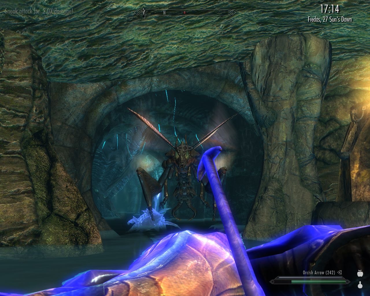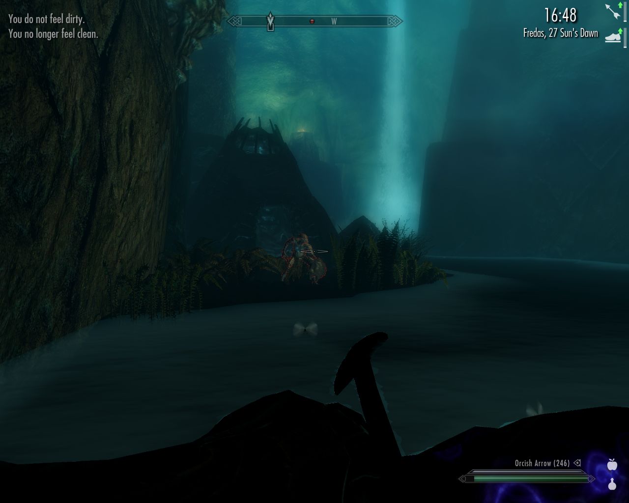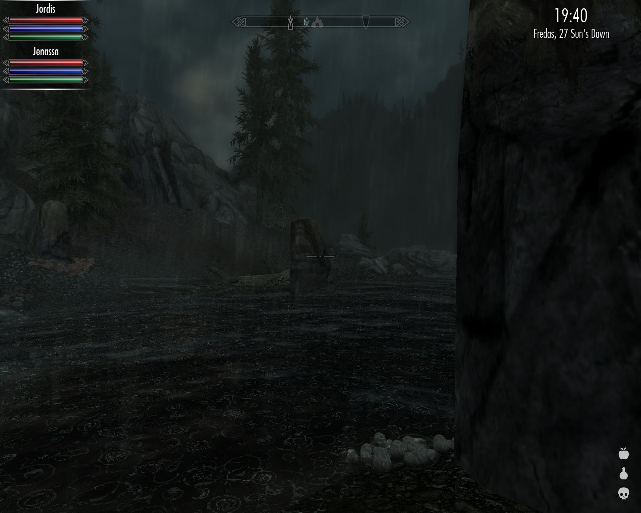As you can guess, when one is desperately clinging to any hand- and foothold on her way down hundreds of meters, there's no control over direction. After I've-no-idea-how-long time, I find, to my utmost relief, a somewhat larger patch of ground. It is on the bank of yet another fast-flowing river at the foot of yet another waterfall ten of twenty meters high. There's a cave entrance nearby. It's called Darkwater Pass. Wow. Is it just a name or is there really a pass that takes you safely through those deadly mountains? Got to find out, what? So I teleport the girls to me and we go in.