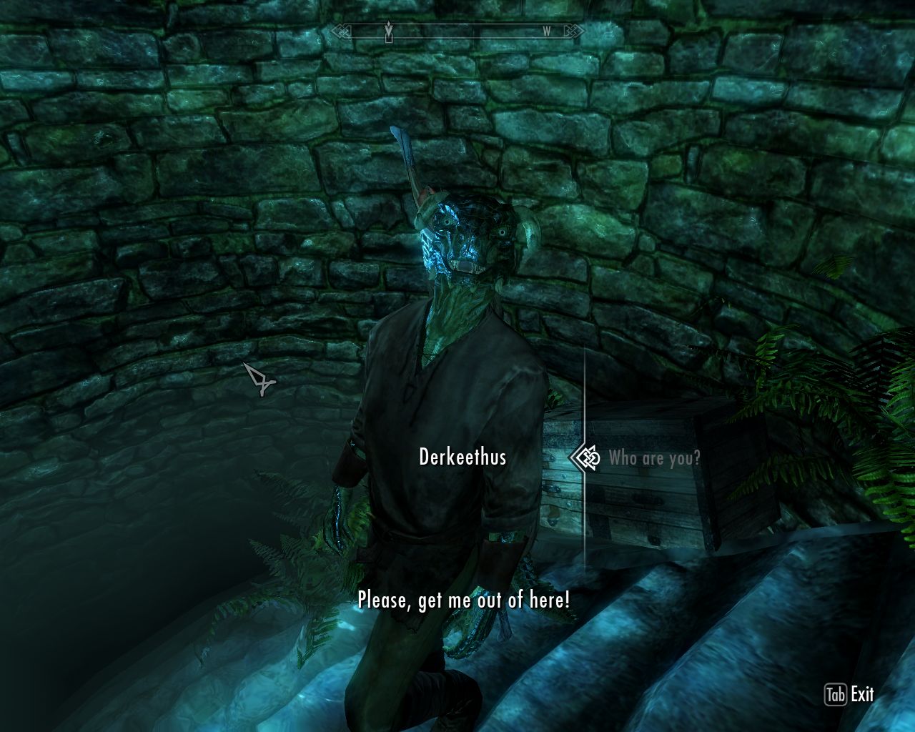 Eventually, we find a cage with an Argonian man inside. Not too bad-looking if I may say so. It's that Derkeethus guy from Darkwater who went missing months ago and whom I was trying in vain to find on that day we accidentally discovered Nimalten instead. Now we've finally located him by sheer chance.