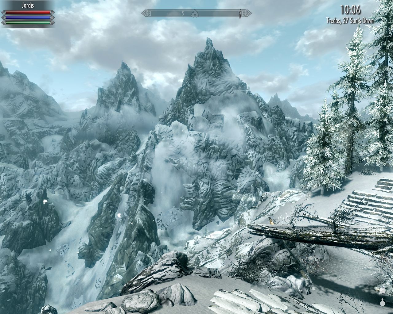 I leave my followers waiting in High Hrothgar and run up the mountain alone. I can now consider it proven that Spriggan Soap protects me from the hurtful fog. Evidently animals are immune to the effects of the fog and the soap makes the universe perceive me as an animal. I can feel a kind of a weird prickling and even ever-so-slight pain, but that may well be just fear. So in all likelihood the fog wouldn't hurt my followers either, but I don't want to take the risk.