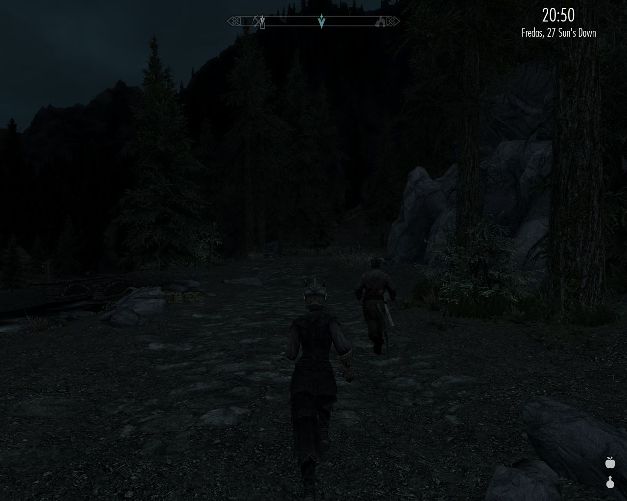 Our next destination after Ivarsted is Cragslane Cavern south of Vernim Wood where we will hopefully catch some skooma traders. This means descending the mountains from Ivarsted towards Darkwater as we've done before. The weather is nice and I feel playful, so I choose a slightly more southerly route.