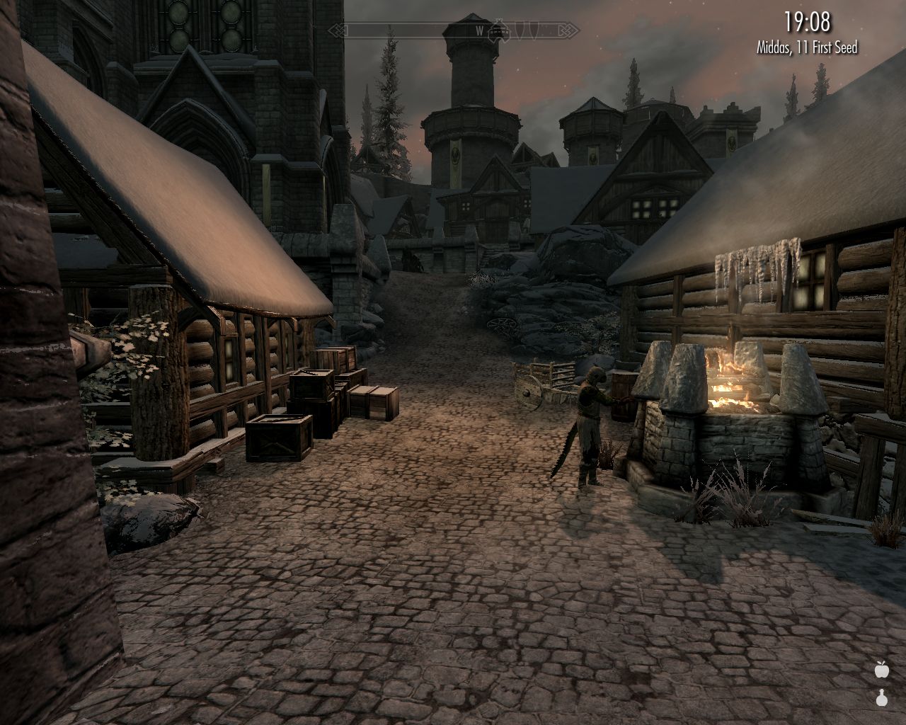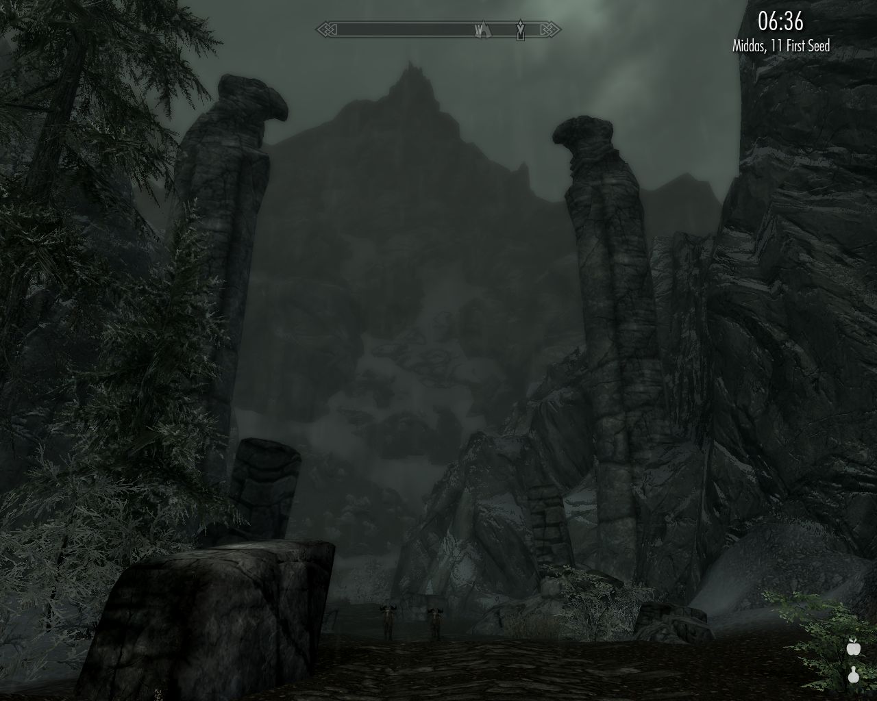 I greet back in the human language and then address my followers, opening a discussion on the question if we should follow the road uphill or downhill. FYI, the former would be north and the latter would be south. Our map is of no help. We must be outside of Skyrim.