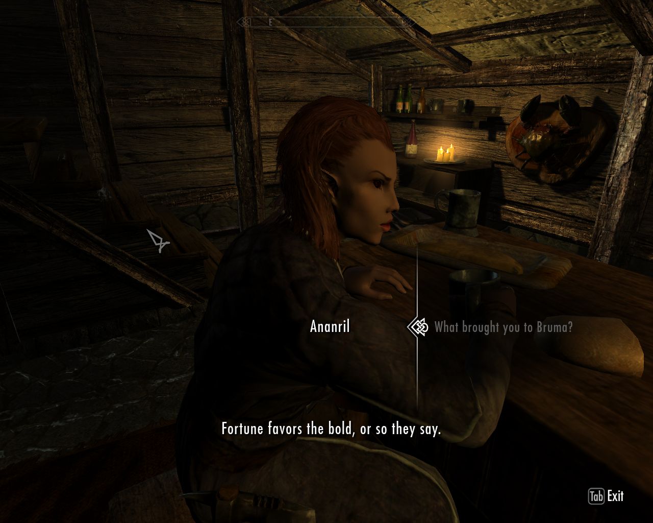 I realize I haven't noticed many Bosmer women so far. Guess I've been paying closer attention to the men. Ananril is an alchemist originally from the city of Chorrol, and when she settled down in Bruma, she turned out much better than the locals, so even though some people keep frequenting the human alchemists they're familiar with, Ananril is doing pretty good business and is content with her life in Bruma.