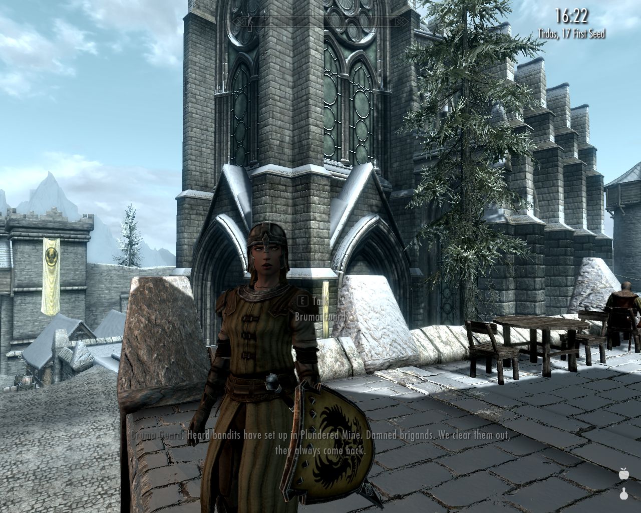 As for the weather, I find it refreshing, even though I'm dying to get into a warm bath. But I have a job to do, so I approach the first female soldier I see. Should have started with that. I learn there has been some trouble with some kind of undesirable people who have entered illegally from Skyrim, and that Harran was a member of a patrol that went south. I have the feeling she doesn't like the topic and neither do a few other soldiers I ask.