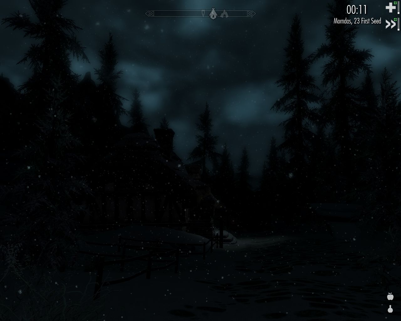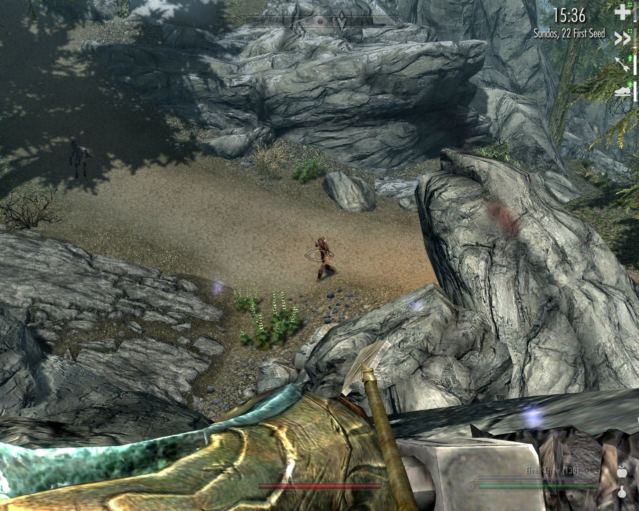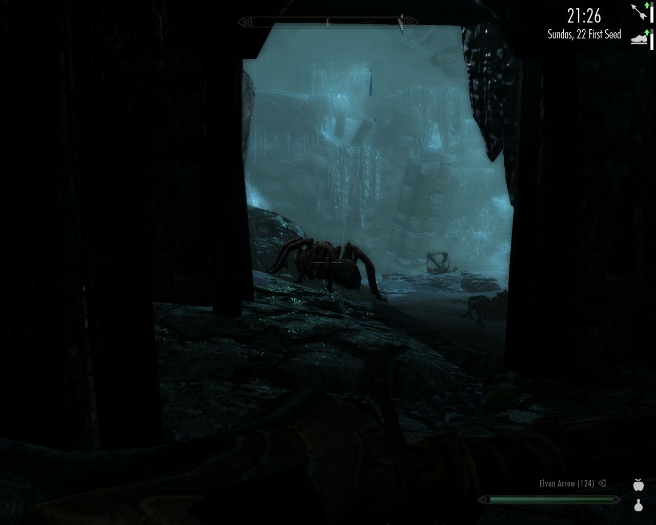 When we run past the citadel where I first met Ungveir and look back in the direction we came from (see picture above), the beautiful stars in the sky improve my mood somewhat. Those supposed Akaviri ruins (a large system of icy stone caves with much rubble everywhere) are, however, somewhat of a disappointment. I mean, there's nothing like an exciting challenge. All we encounter are quite common poison spiders.