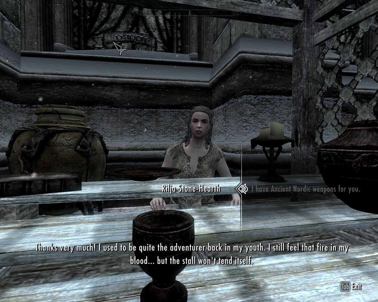 1. The Ancient Nord weapons seller Rilja has asked me to bring her Ancient Nord weapons, and we looted many of them yesterday.