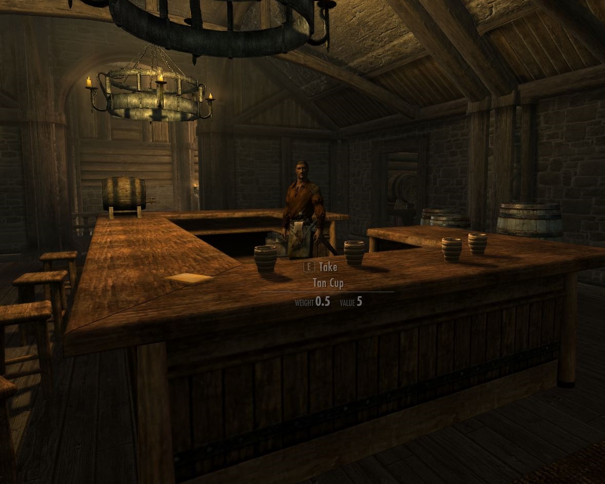 Long before we reach Snowstone Rest, Scruffy comes running along the road. He escorts us to the inn, jumping around us and barking happily. Erlus is just coming out, apparently to do some work outside. There's no one in the taproom. I tell Erlus not to mind us. We just want to rest for a moment, and should we take something from the bar, we'll give money to Scruffy. With a hint of a chuckle, Erlus leaves with Arnoth, his Bosmer helper. Me and my followers go inside