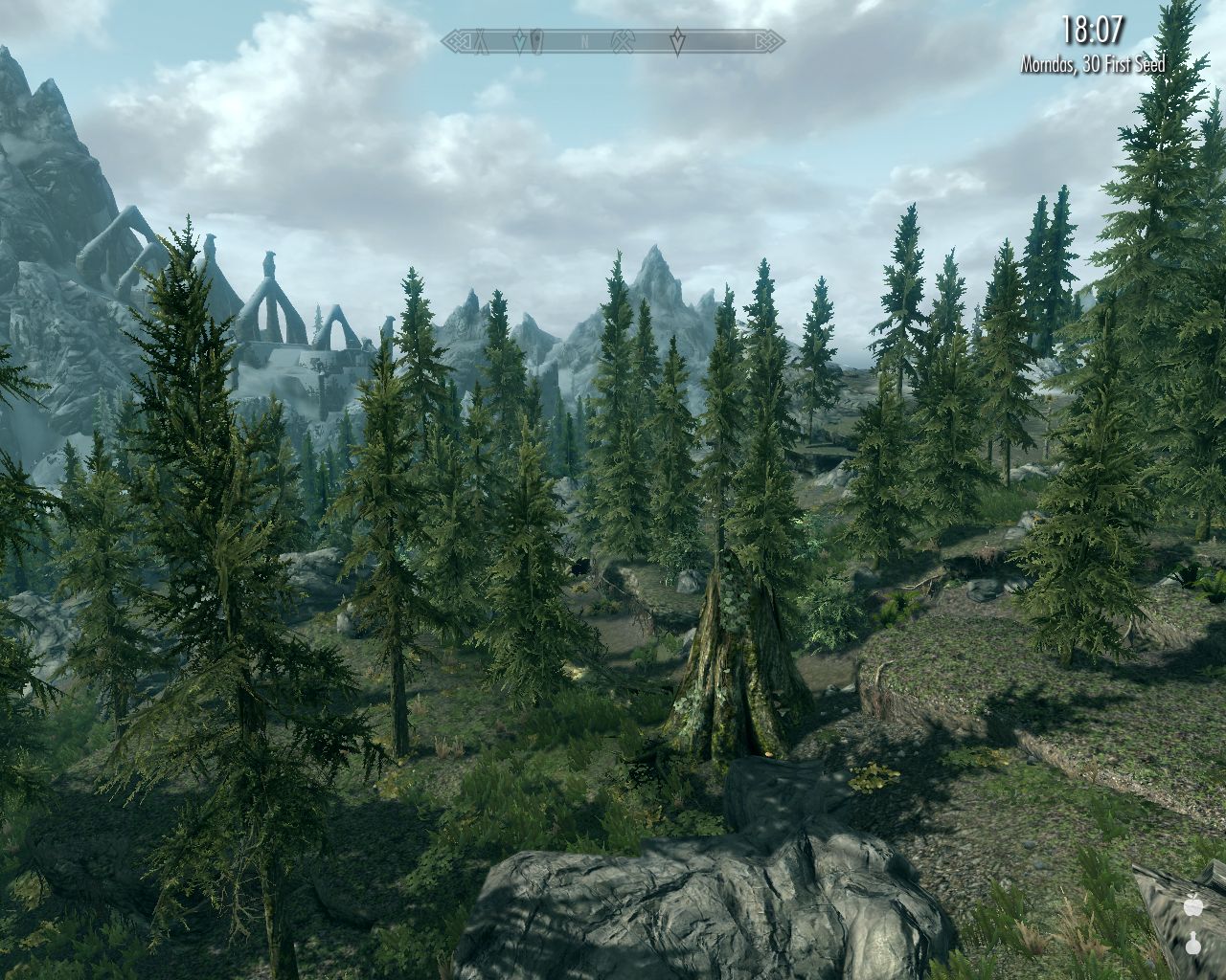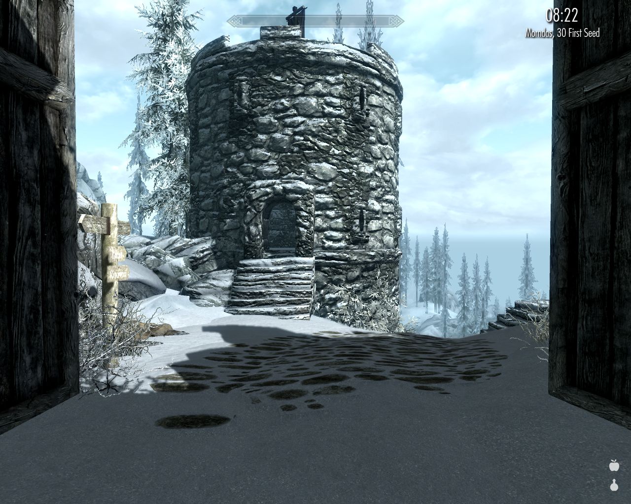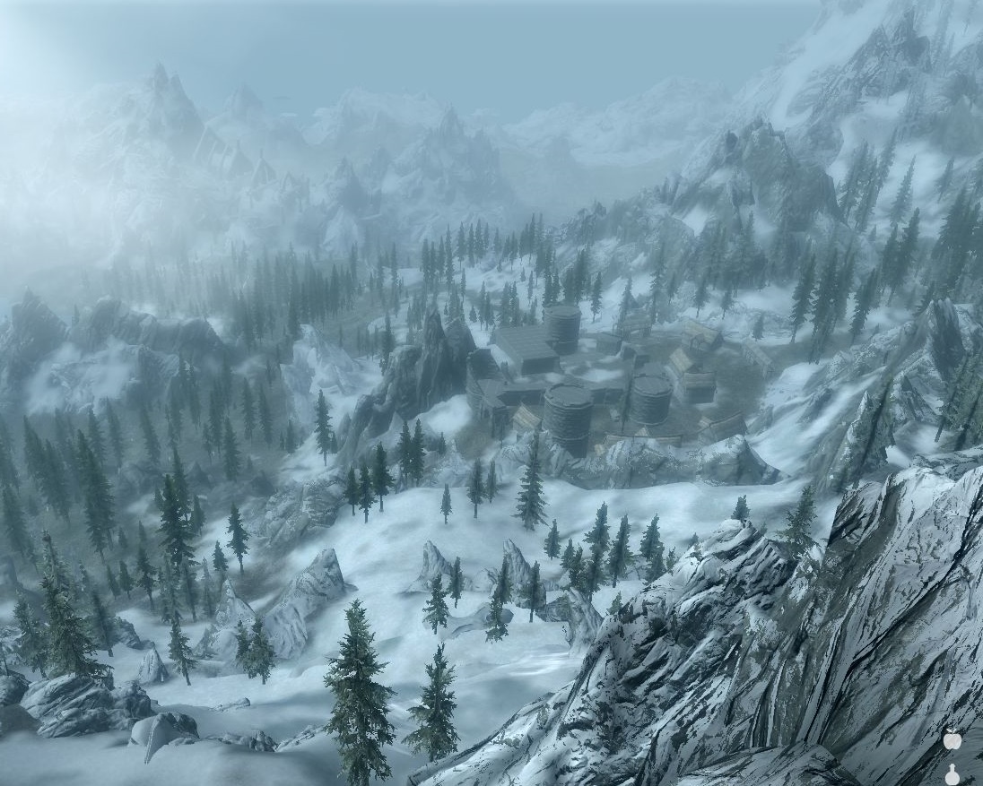 Thanks to our Cushioned armors and boots, we can try to go straight down the mountains instead of traveling by the road through Fort Neugrad (see picture below) and Helgen.