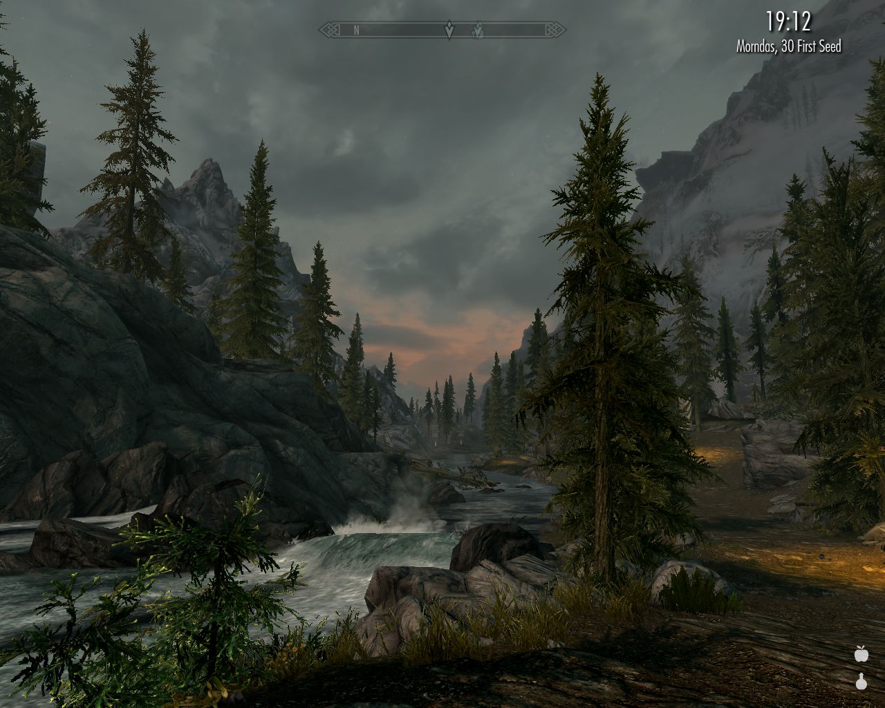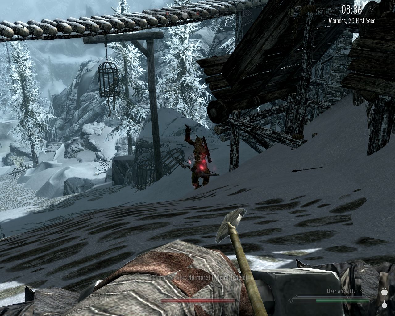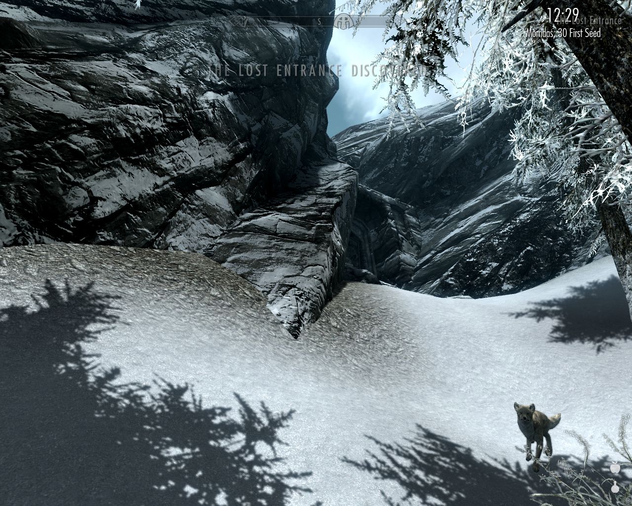 Thanks to our Cushioned armors and boots, we can try to go straight down the mountains instead of traveling by the road through Fort Neugrad (see picture below) and Helgen.