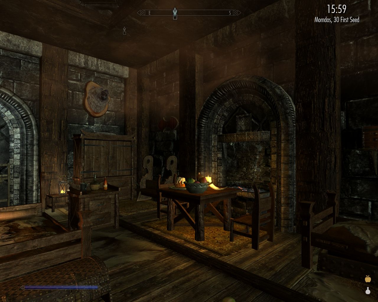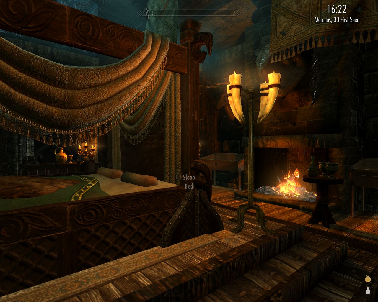 I walk to The Sleeping Giant where I talk with Esja until my boyfriend arrives. Then I go with him into the secret room where we make love. Getting dressed again, I put on a beautiful blue dress from Bruma. Hadvar and I go to the taproom and talk a while with Camilla and Alvor.