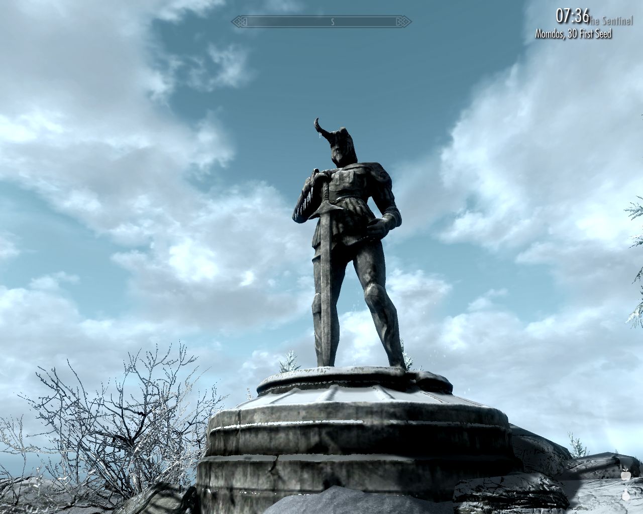 I think she's right. However, at this moment, when I look at the spruce forest north of us and the almost-mountain-high stone arches in the distance, I realize I'm so thrilled being back in Skyrim that I can't make myself care about the Dreamborne Isle after all. Let's spend some time in the midst of this cozy familiarity. Besides, we have things to do in Skyrim that are far more important than that missing Aulbryn dude.
