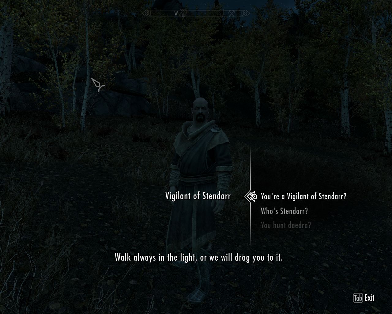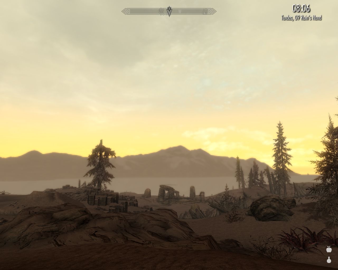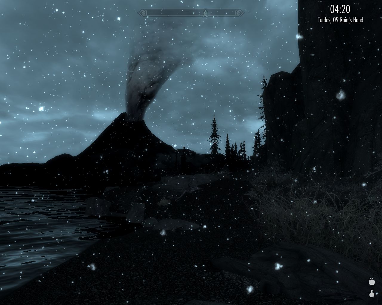 At this hour, the area south of Skaal is completely dark like the Winterhold region. Only with the help of my Circlet of Night Eye are we able to see where we're going: