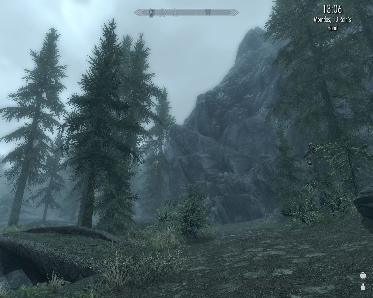 I decide we'll take the easterly road, the one that passes through that bandit ambush point which has a wooden bridge above the road. We should be able to comfortably bypass the mountains southeast of Aulbryn's House.