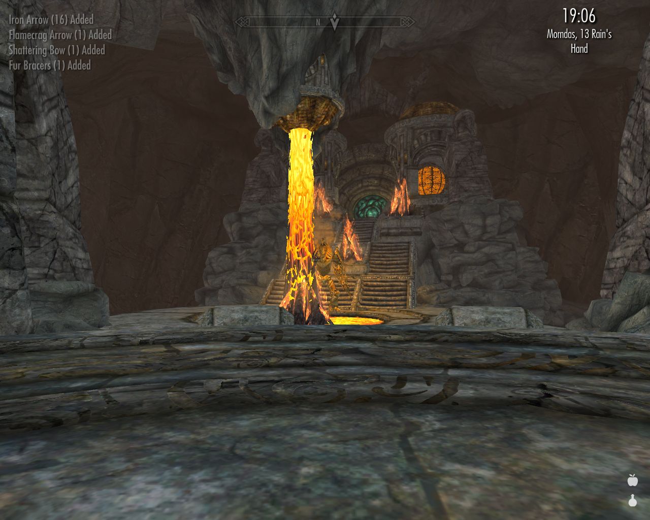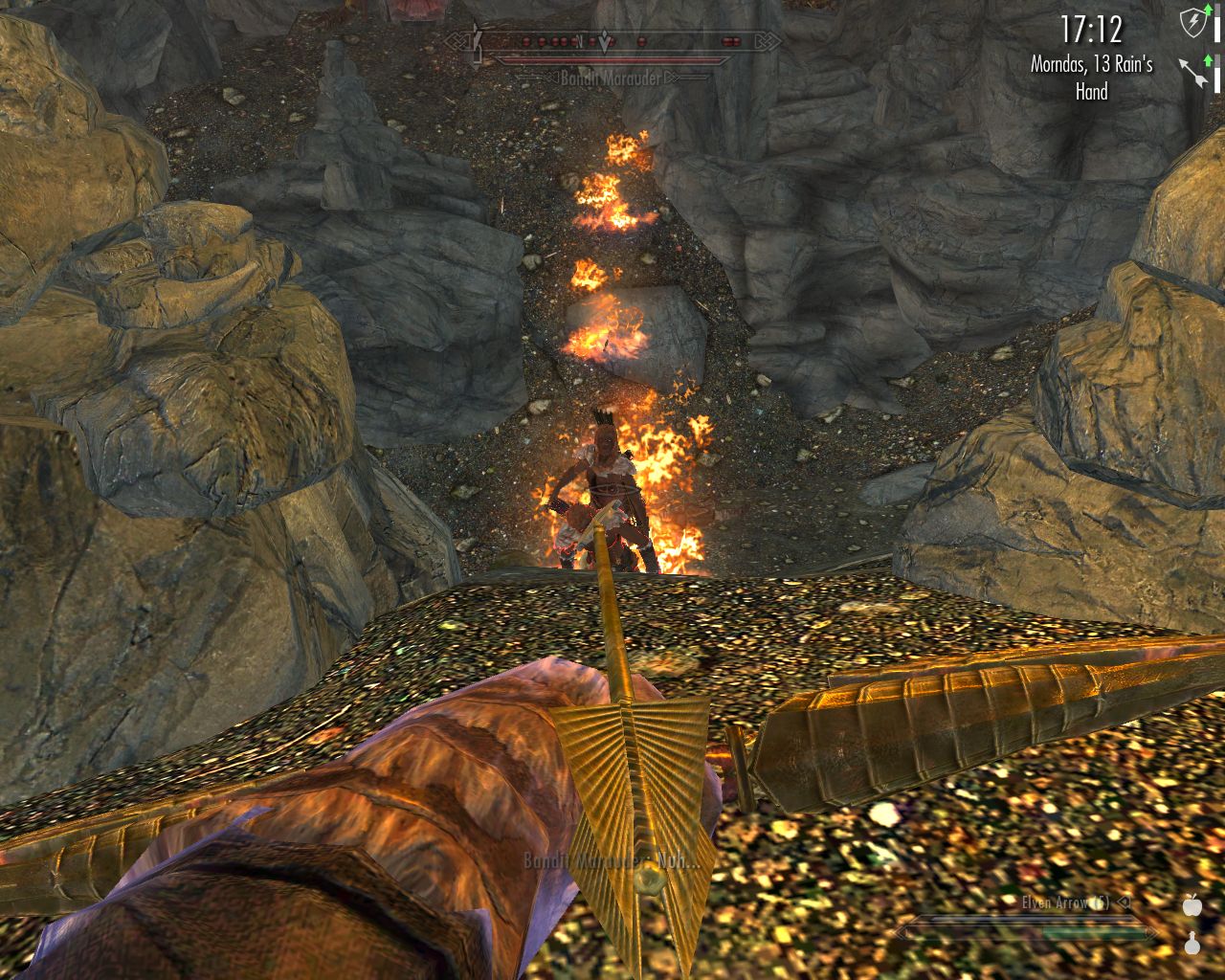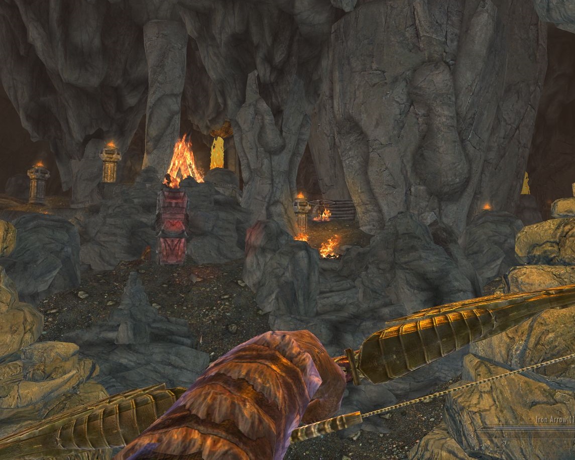 In brief, this is a complete chaos. Whenever the wall of fire in front of me gets a little smaller, revealing a view to an atronach, I shoot. Every hit kills, but the moments when I can see an enemy are very brief and rare. All the while I can hear my girls scream, evidently suffering from fire spells – as am I.