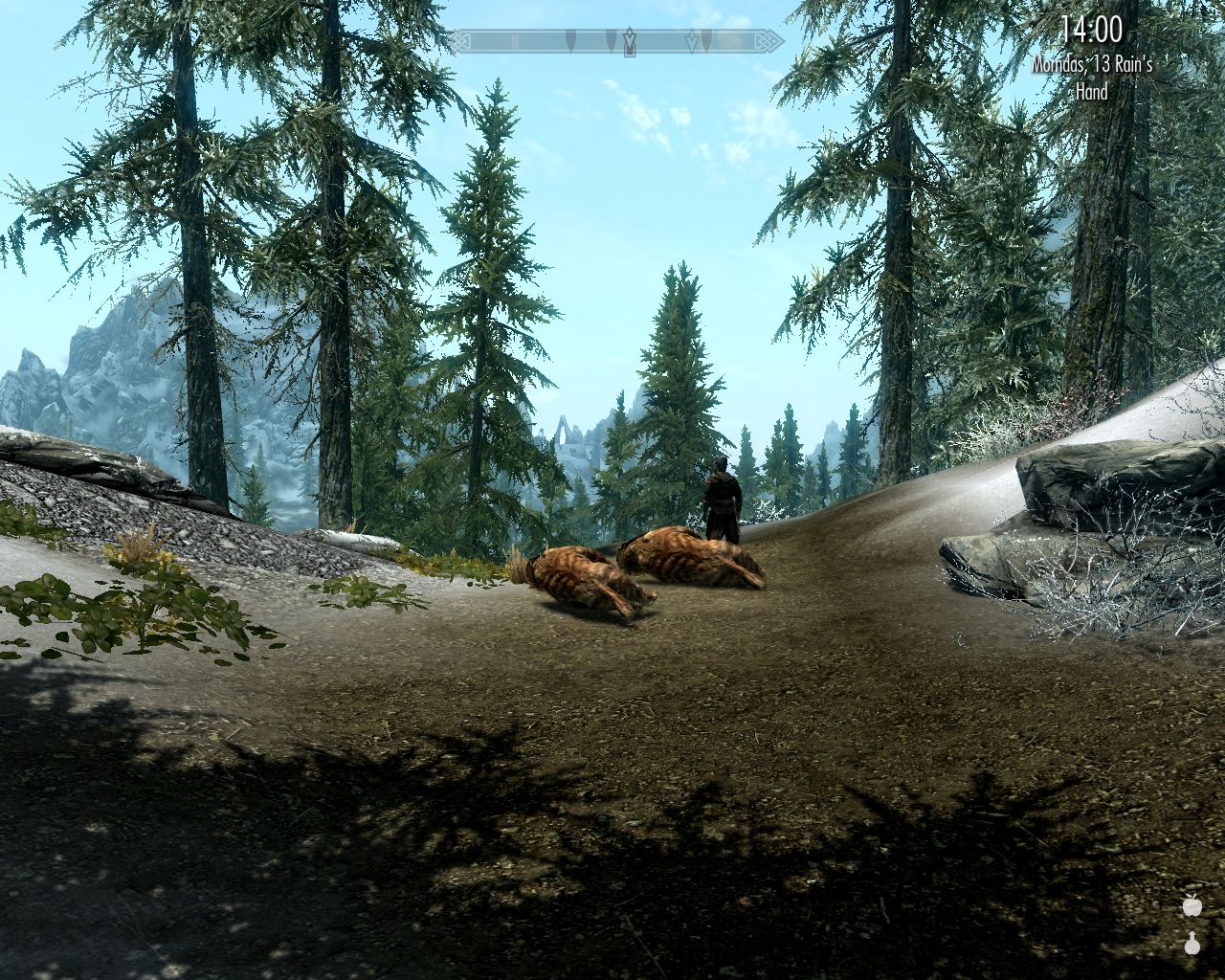 Now, I could help him reach his goal, but having stopped to think about it for a moment, I realize there's no reason for him to die just yet. He's evidently not harassing innocent passersby (such as us) and this region is warm enough for him to wander around comfortably. Let him go on slaying predators (and with any luck even some bandits).