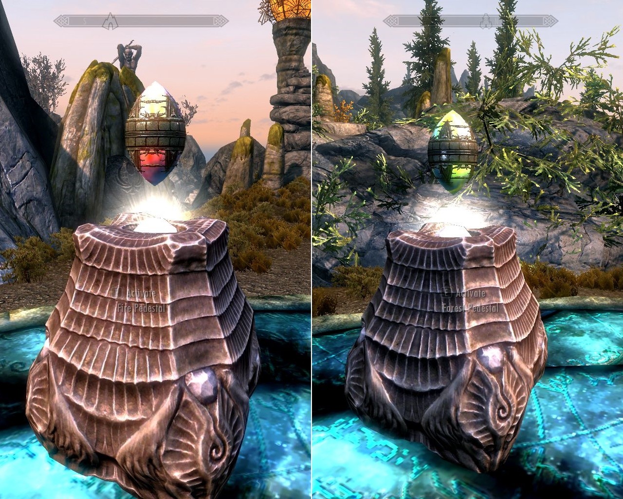 We examine more closely that shrine-like platform of beautiful blue color which we saw yesterday. It has three pedestals not unlike the ones I took those Keystones from. I try to place the two Keystones I have onto them. I mean, they are Key stones and there's a locked door nearby.
