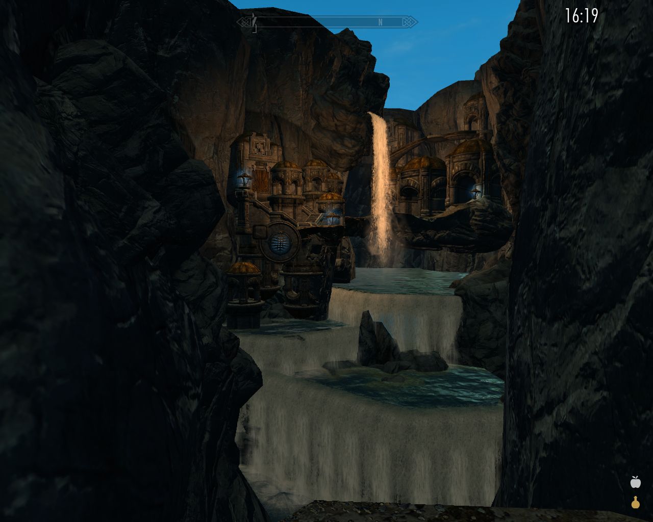 We quickly run forward until we reach a somewhat drier place. There are high near-vertical rock walls on both sides, but we can also see some Dwemer-style structures above us, and, considering this place is called Elysian Ascent , it is not entirely unreasonable to presume there must be a way that leads up there.