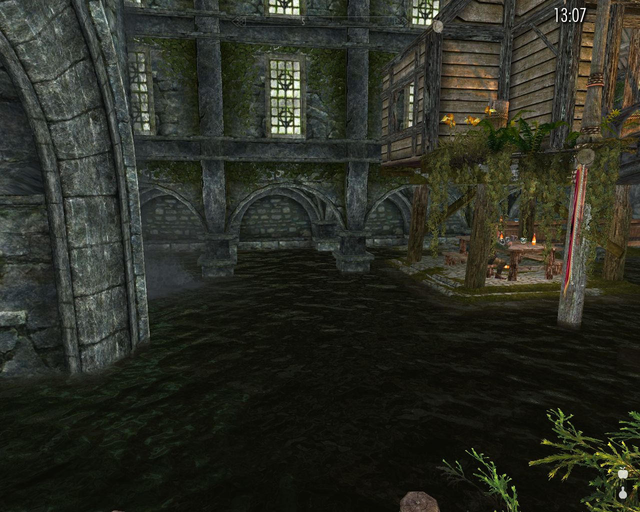 We now run to that Riverbed... I mean, Riverhead Manor and go through one of those cheaty doors that lead us into a pond between house walls. This time, instead of trying the other doors, we follow the waterway into the open. There are indeed further ponds and streams, and a structure very high without any evident way of getting there.