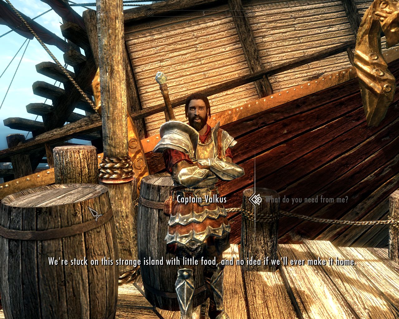I ask him if he's the captain. "Wow, you really don't remember anything, do you?" he replies, and explains me concisely and clearly how "our" ship called Sandomer was on its way from Solitud to Morrowind and got attacked by several dragons. The ship was heavily damaged and some of the crew killed.