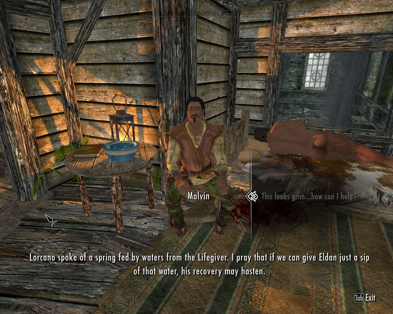 Next to a high stone building with large windows, we notice a wooden house whose door is actually wide open. Inside is a bed, on which lies a badly injured man. His name is Eldan and his brother Malvin is taking care of him as well as he can.