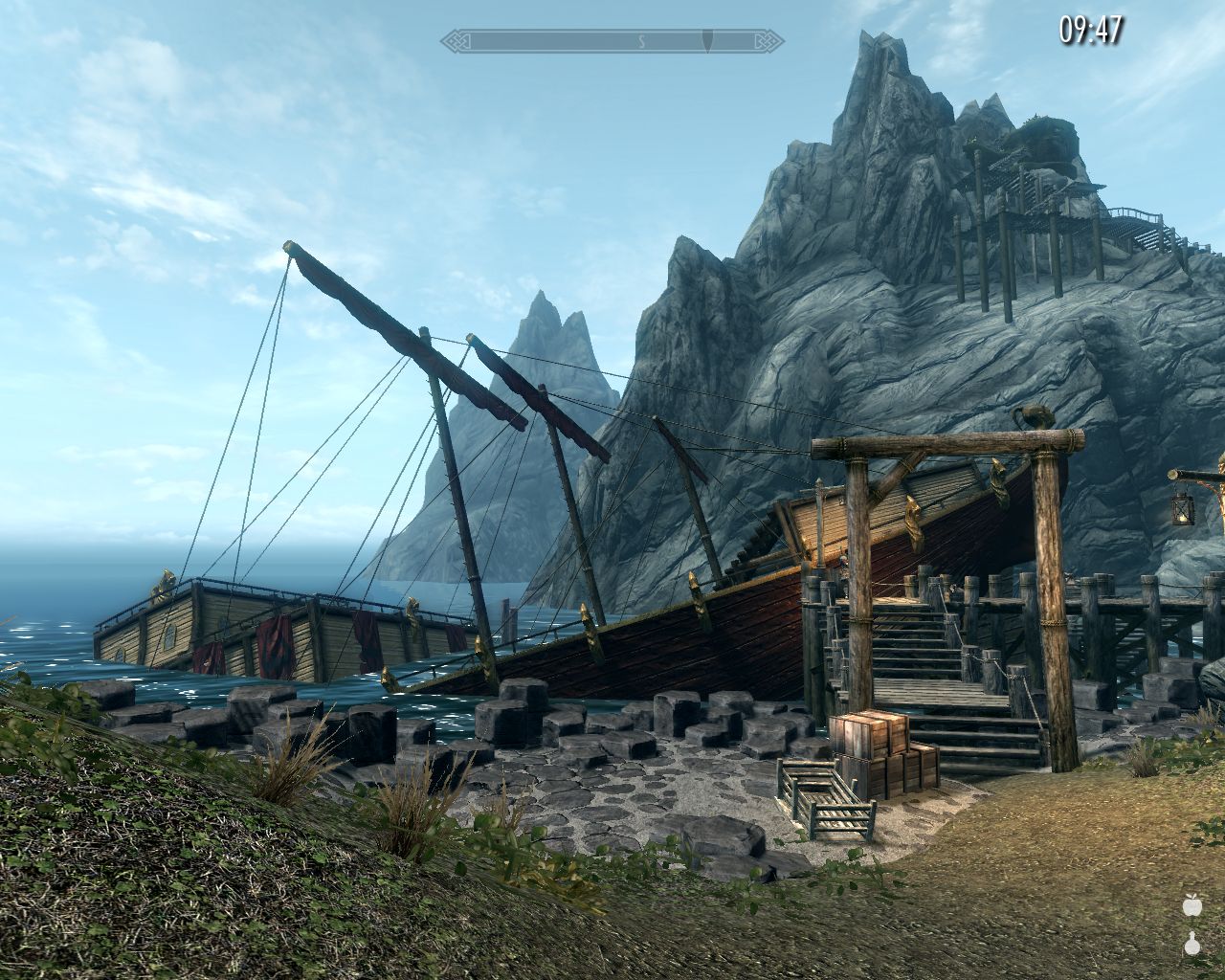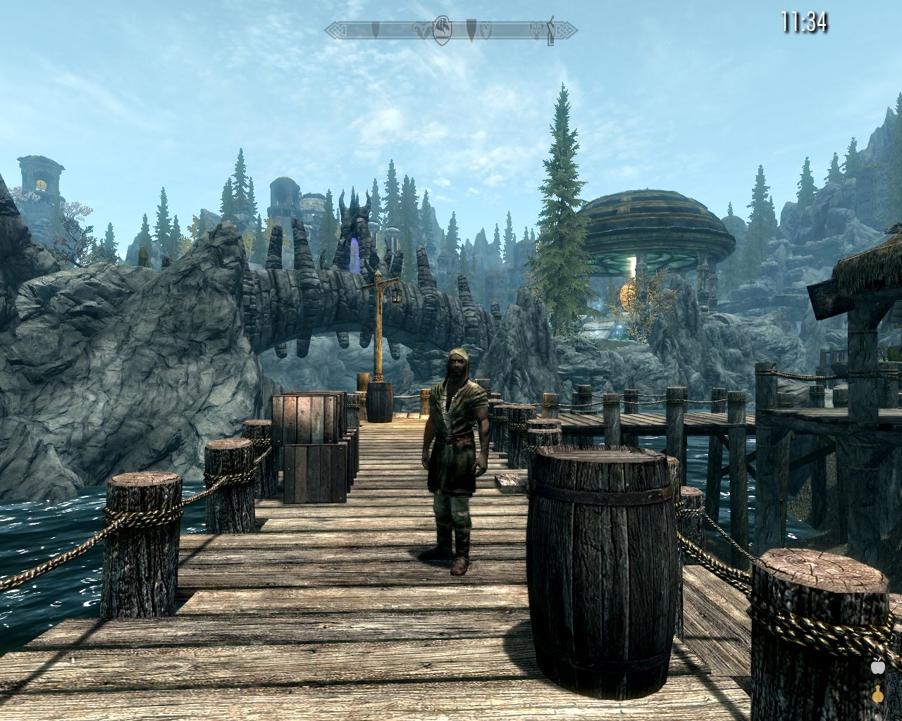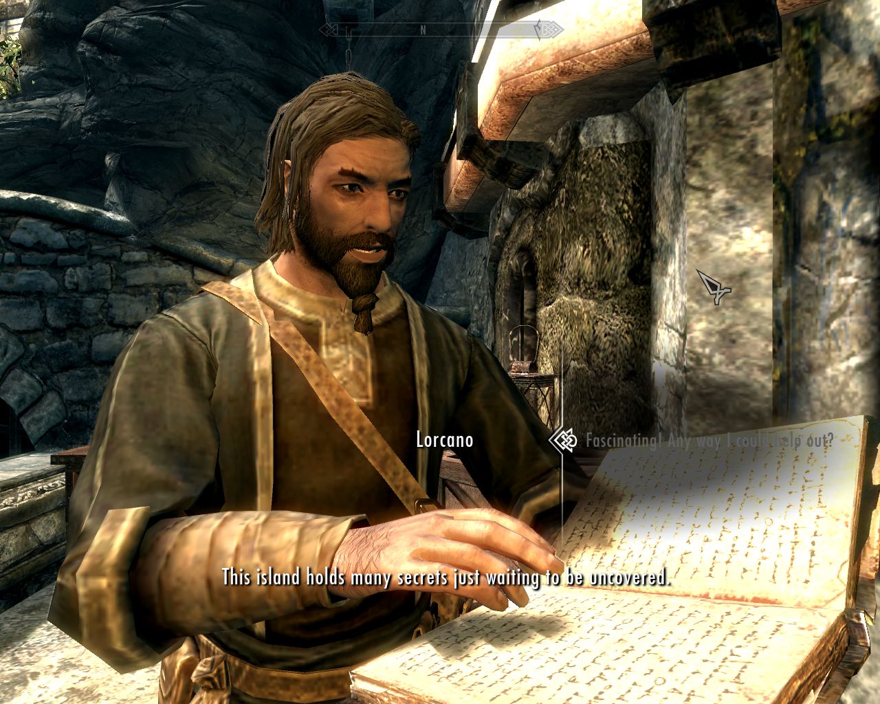 Yes, a strange island indeed. At least as far as people are concerned. I mean, both that Wilhelm guy and now this Captain Valkus are obviously recognizing me. I ask cautiously how I ended up on his ship. Fortunately, Valkus seems to have full understanding for my apparent memory loss and tells me I joined them some time ago in Windhelm. I scrubbed the decks to pay my dues, he says. Then he asks if I have seen Lorcano, by any chance. I say I haven't. Valkus says we must do everything in our power to find him. Weird in his head as Lorcano may be, he knows more about this region, as well as about the dragons, than any of us, and is therefore our best hope of figuring out a way of defending us against those dragons who might attack us again at any moment.