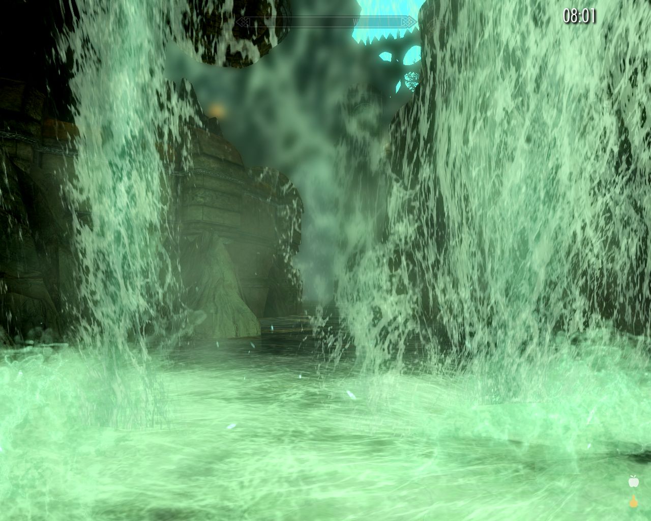 We go through the portal and end up in the midst of very much green splashing water descending from extremely high waterfalls that seem to be everywhere around us.