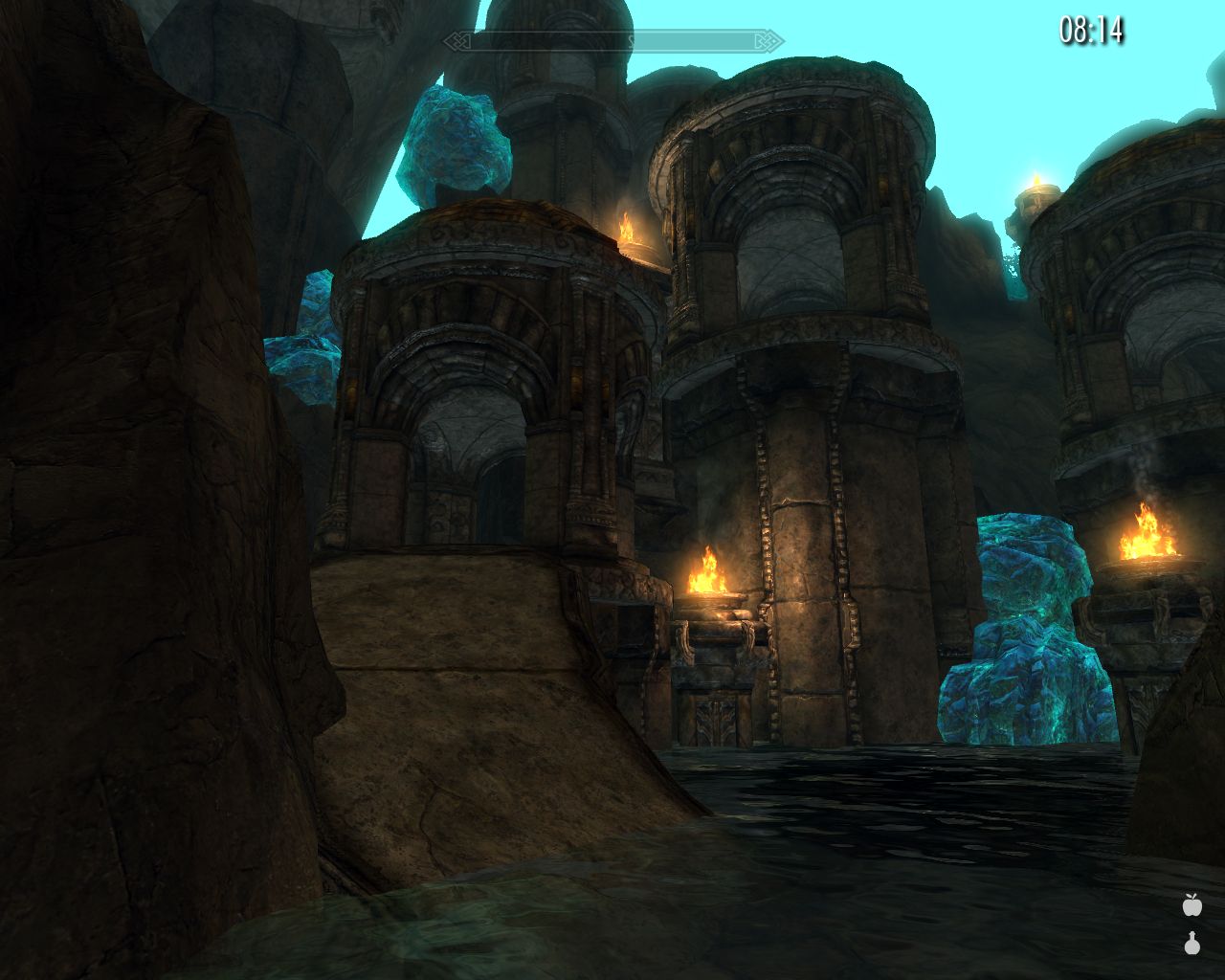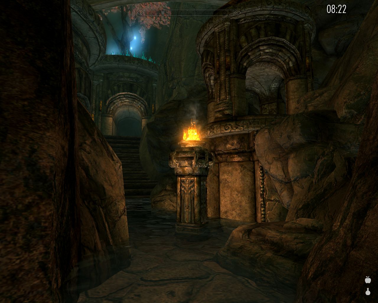 This time, we cross the bridge. Near the main entrance of the so-called temple is a door with an unpickable lock. Inside the huge temple complex itself which, as you may remember, is utterly unnavigable, Bardslayer gives me the ability to float in the air, thanks to which I find the Forest Keystone.