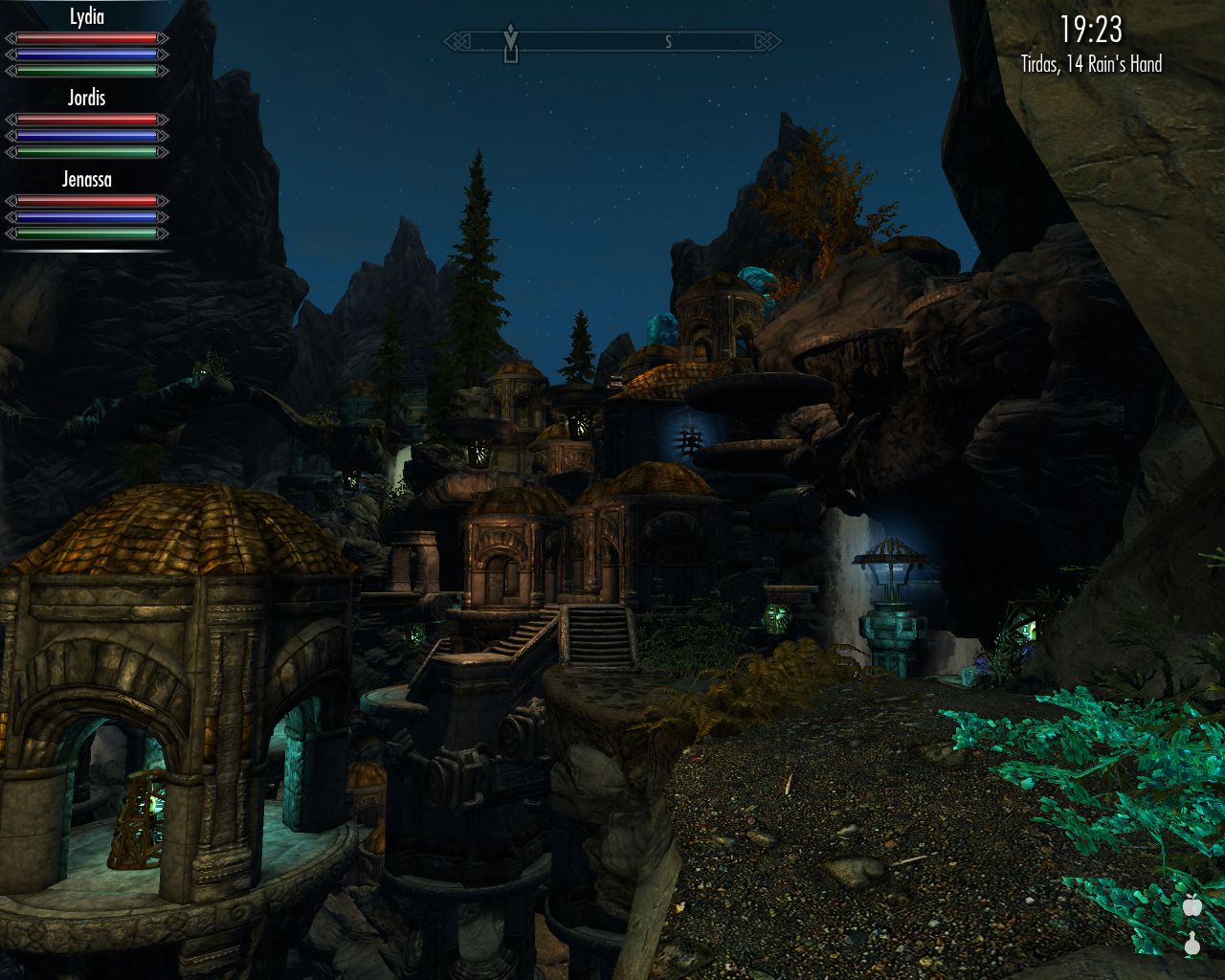 Strangely enough, it's dark as if it was night – albeit very well lighted by various kind of lanterns. There are big Dwemer-style houses, but much of the territory is covered by stony ground and shrubs and such. I'm greatly amused to find a few actual market stalls scattered around this huge area, but its hallmark are countless walkways at widely varying elevations, not unlike the ones in the Woodpeak "Temple". And they are just as chaotic and unnavigable.