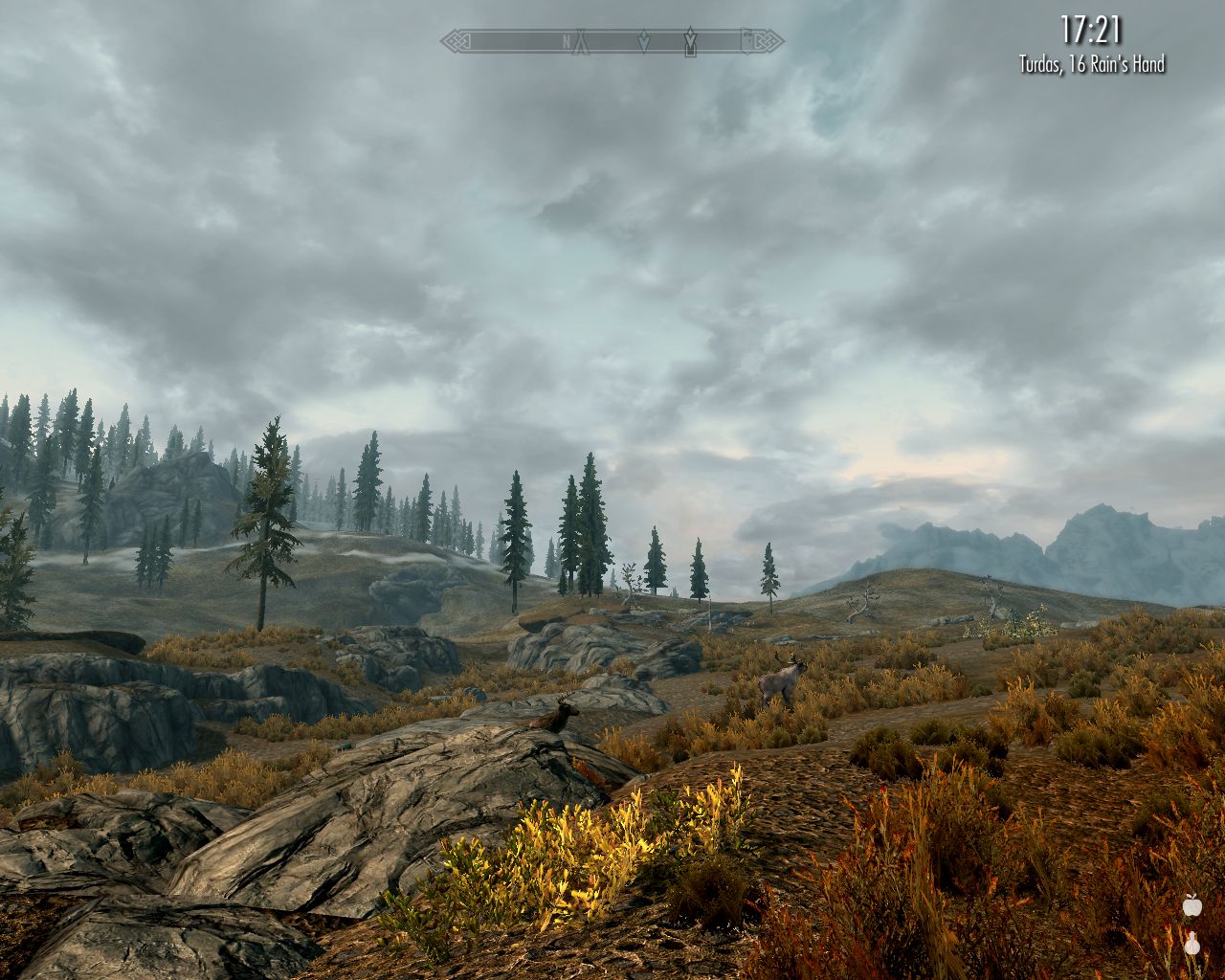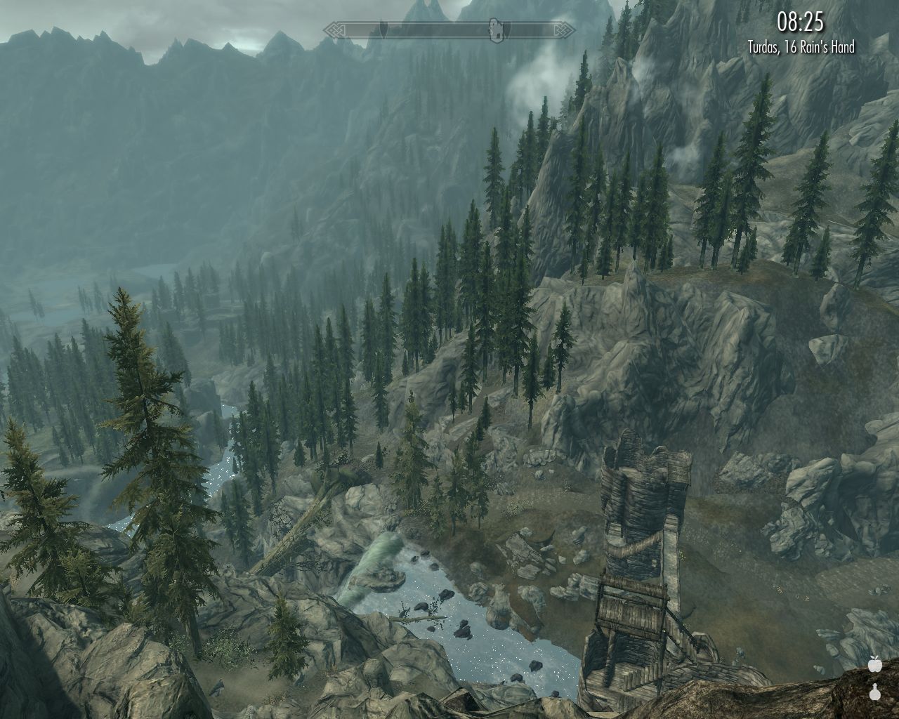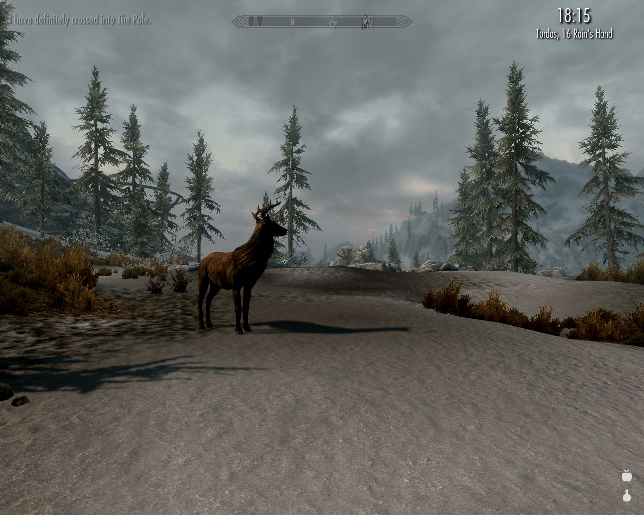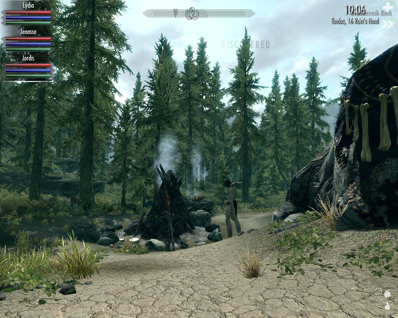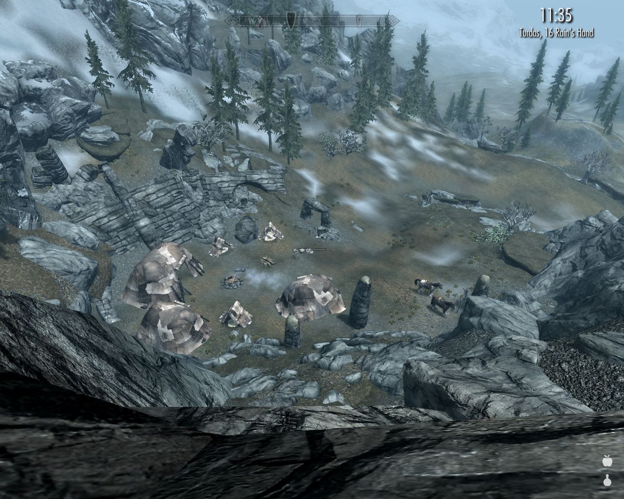 We're basically headed for Dånstar to travel to Falskaar. We could go via Windhelm or via Hviterun. The latter way is a little shorter, so we choose it after some discussion. While we're in this region, we explore the mountains south of the Valtheim–Hviterun road to see if we really can't get to High Hrothgar from this direction. We can't, but we do discover the well-hidden Whiterun Stormcloak Camp: