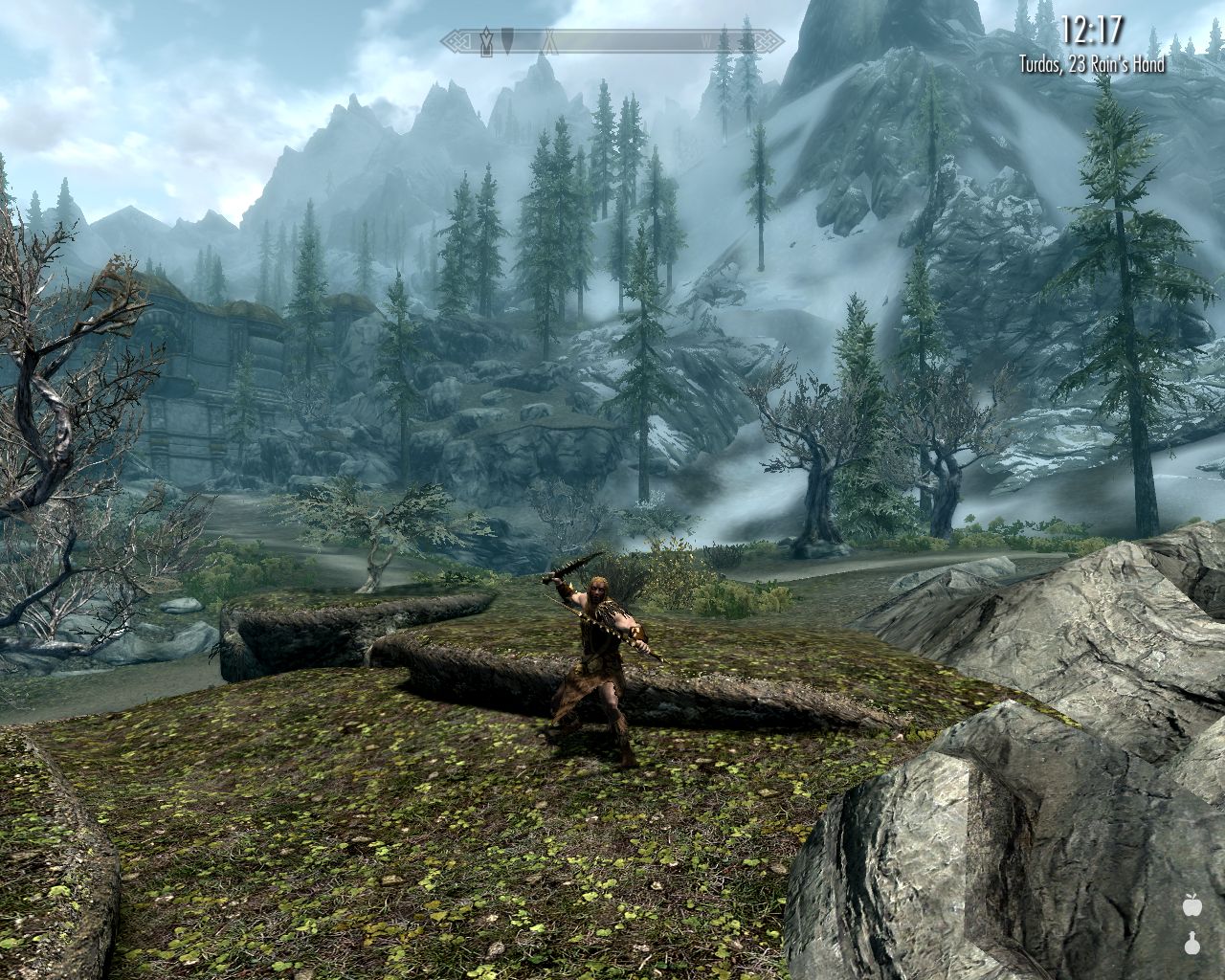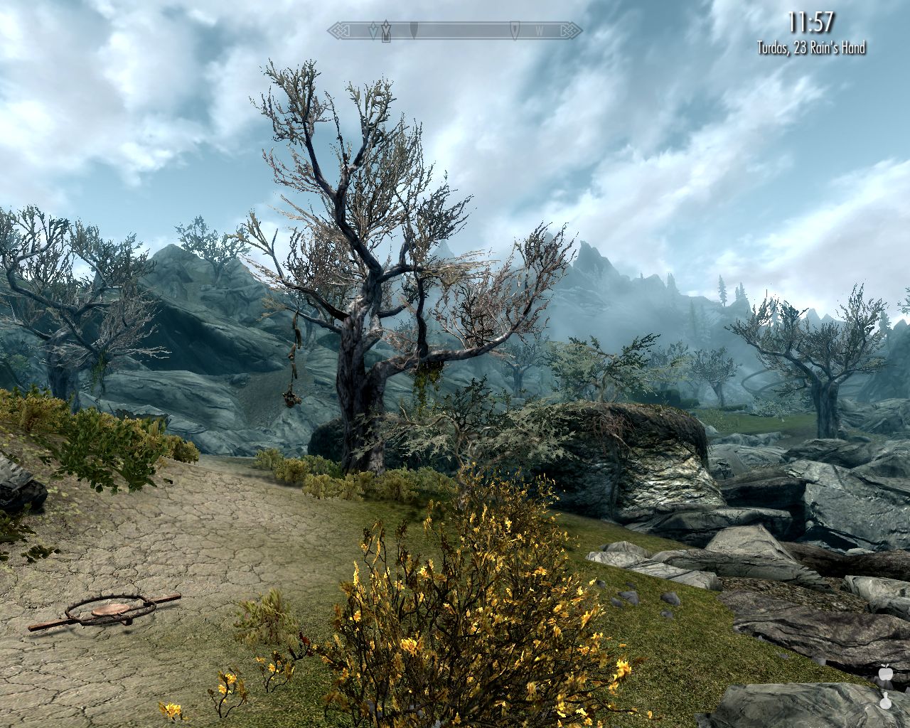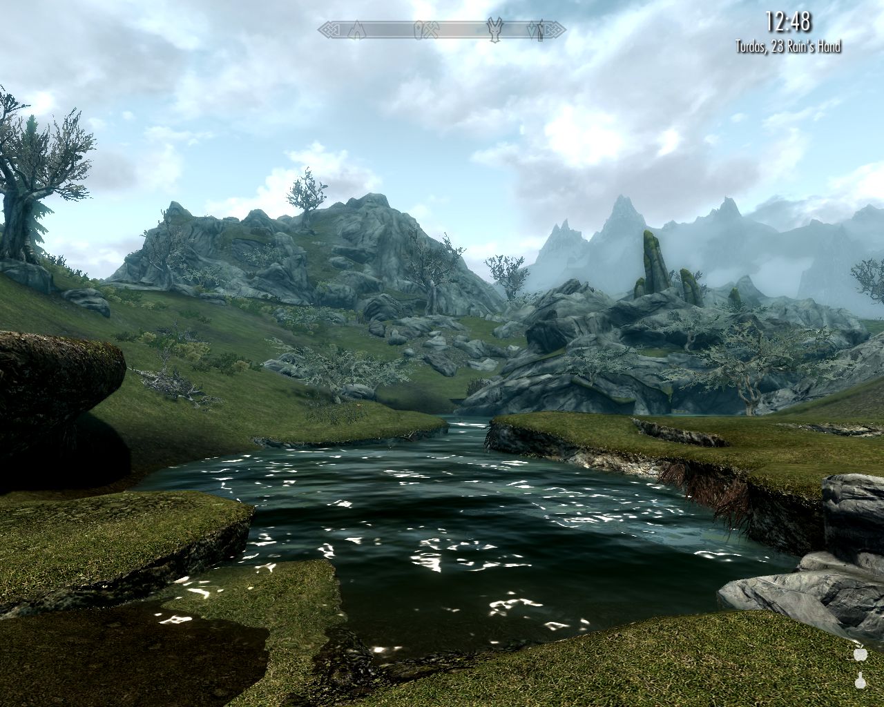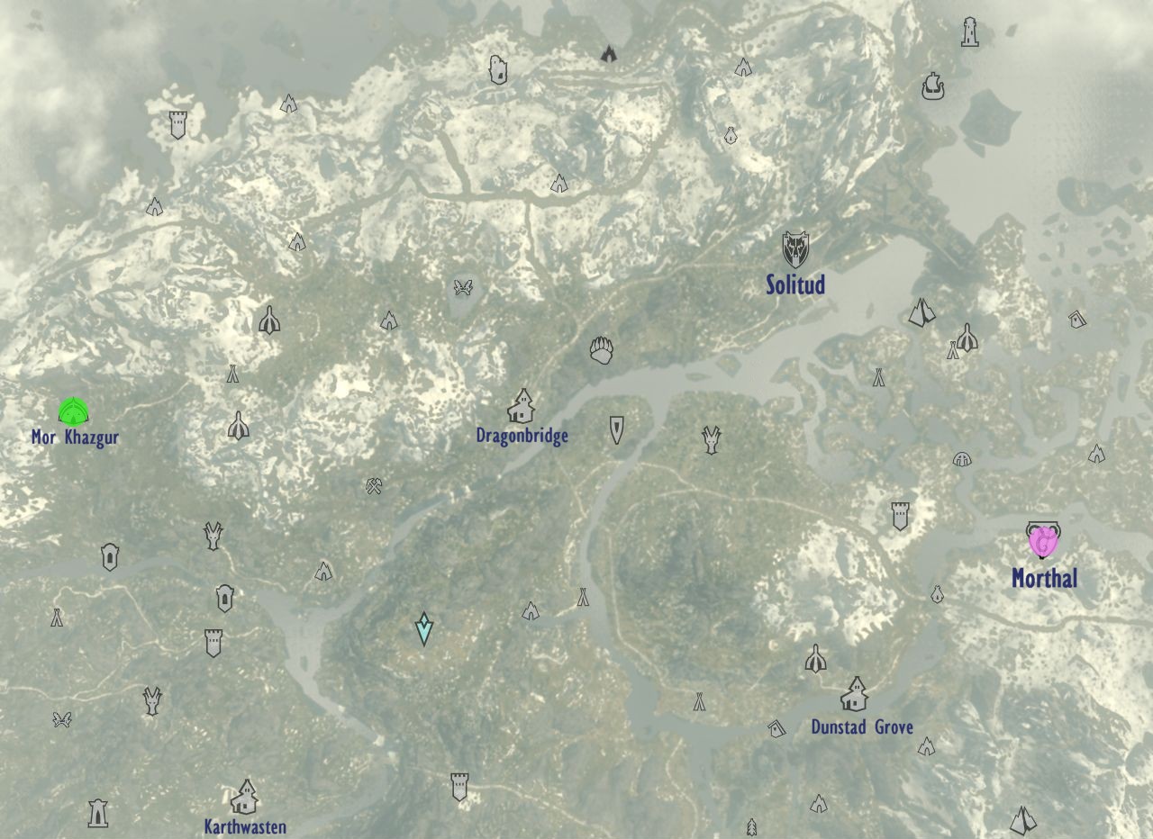 This early we have the awesome bathhouse all to ourselves. While we wash unhurriedly, I realize we won't have to go to Dragonbridge at all on our way to Mor Khazgur. With the nice weather we're having today, I feel like exploring the mountainous area between two rivers south-southwest of Dragonbridge (greenish-blue marker on the map):