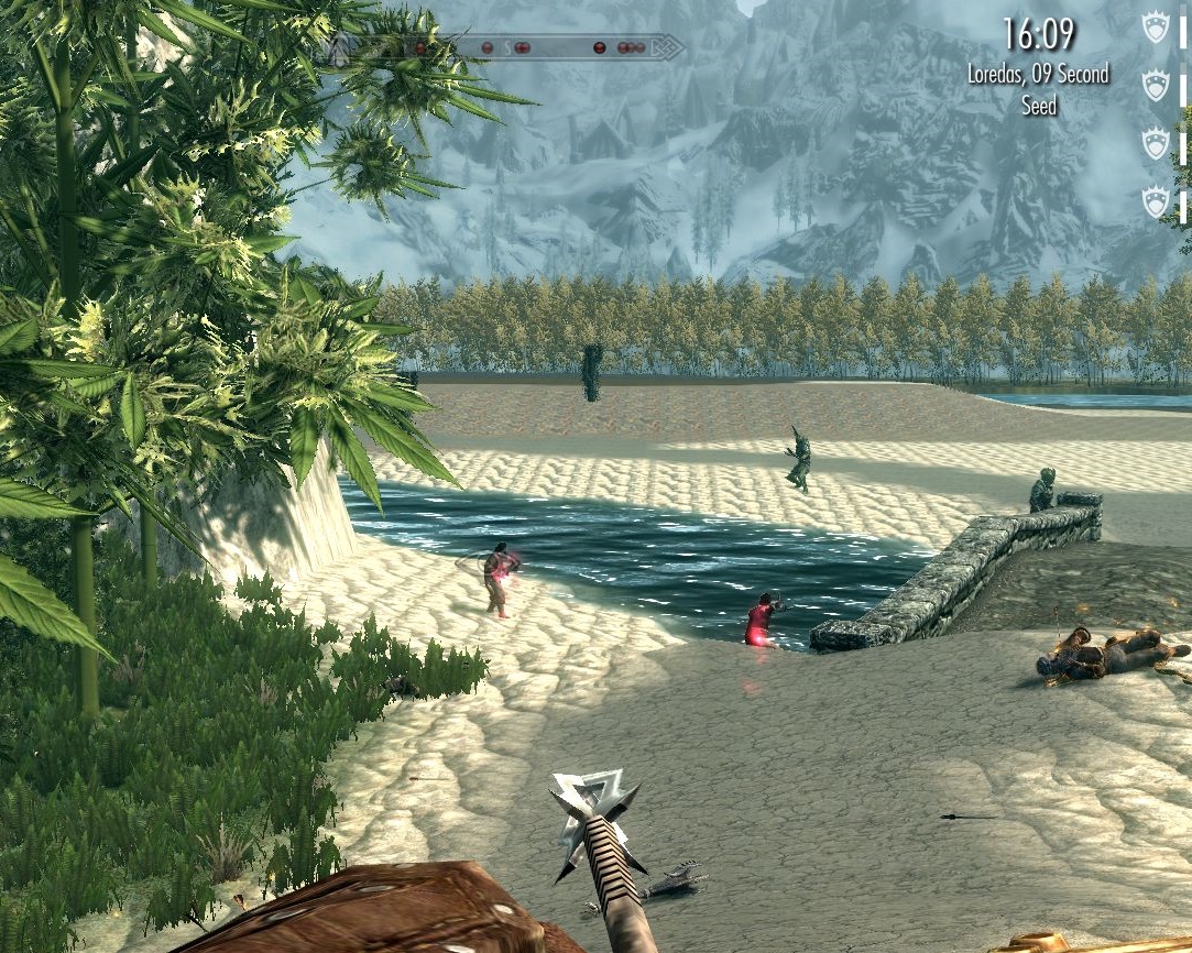 Speaking of maps, I don't have any kind of a map of this area. I wonder how I passed through Hammerfell without a map when traveling from High Rock to Skyrim last year. Was I accompanied by someone? Maybe it's something I'm not supposed to remember. Apart from which, a couple of thalmors attack us now, coming across the bridge in the west. Having killed them, we cross it and reach a massive battle whose participants turn out to be thalmors and alikrs.